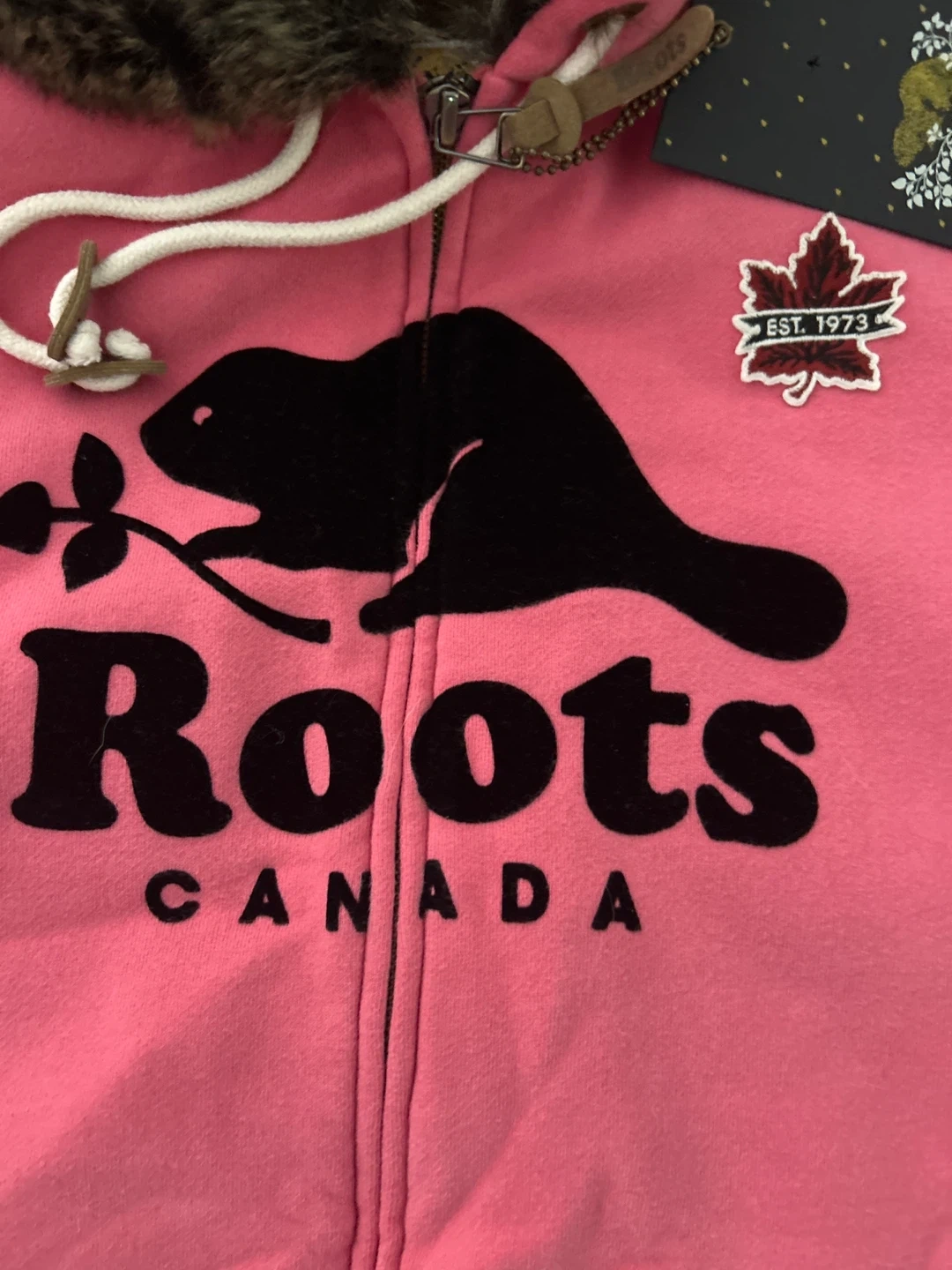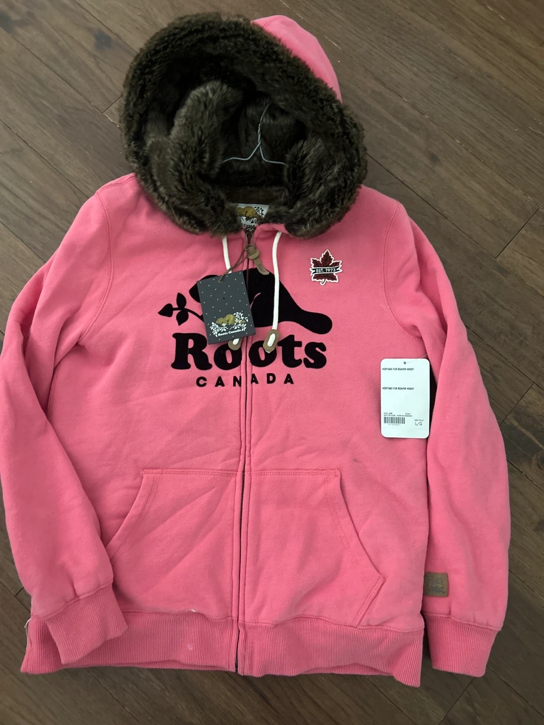 Selling a Roots Heritage Fur Beaver Hoody in Rapture Rose! It's a size L/G. This cozy hoody features the classic Roots beaver logo and a fur-trimmed hood. Perfect for staying warm and stylish!