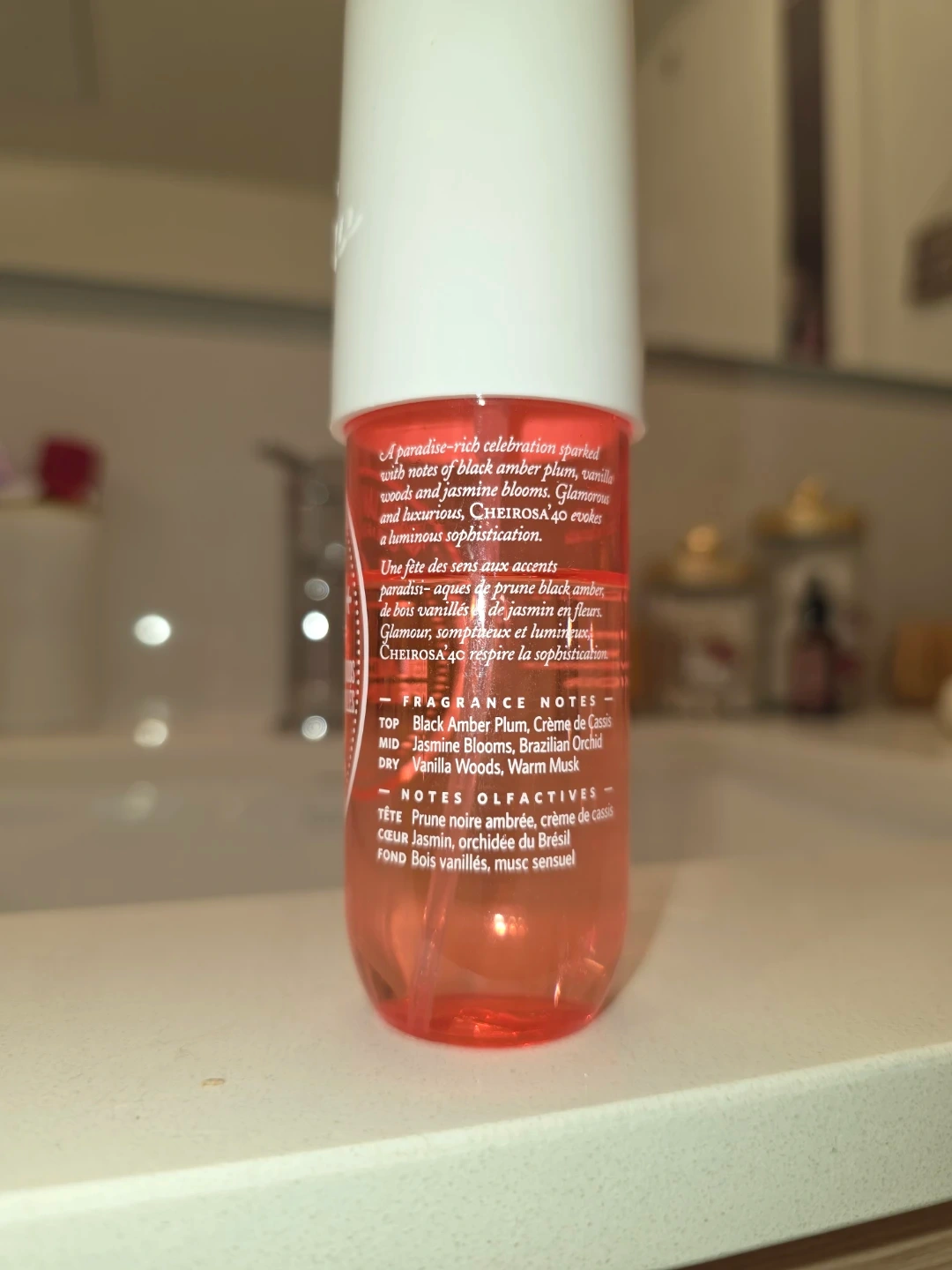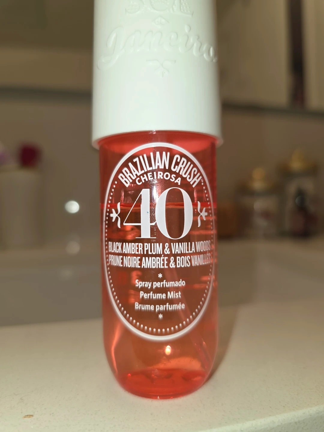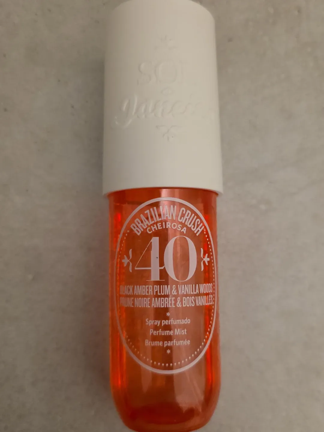 This is the Sol de Janeiro Brazilian Crush Cheirosa 40 body mist. It's a perfume mist with notes of black amber plum and vanilla woods. The scent profile also includes jasmine blooms and Brazilian orchid.