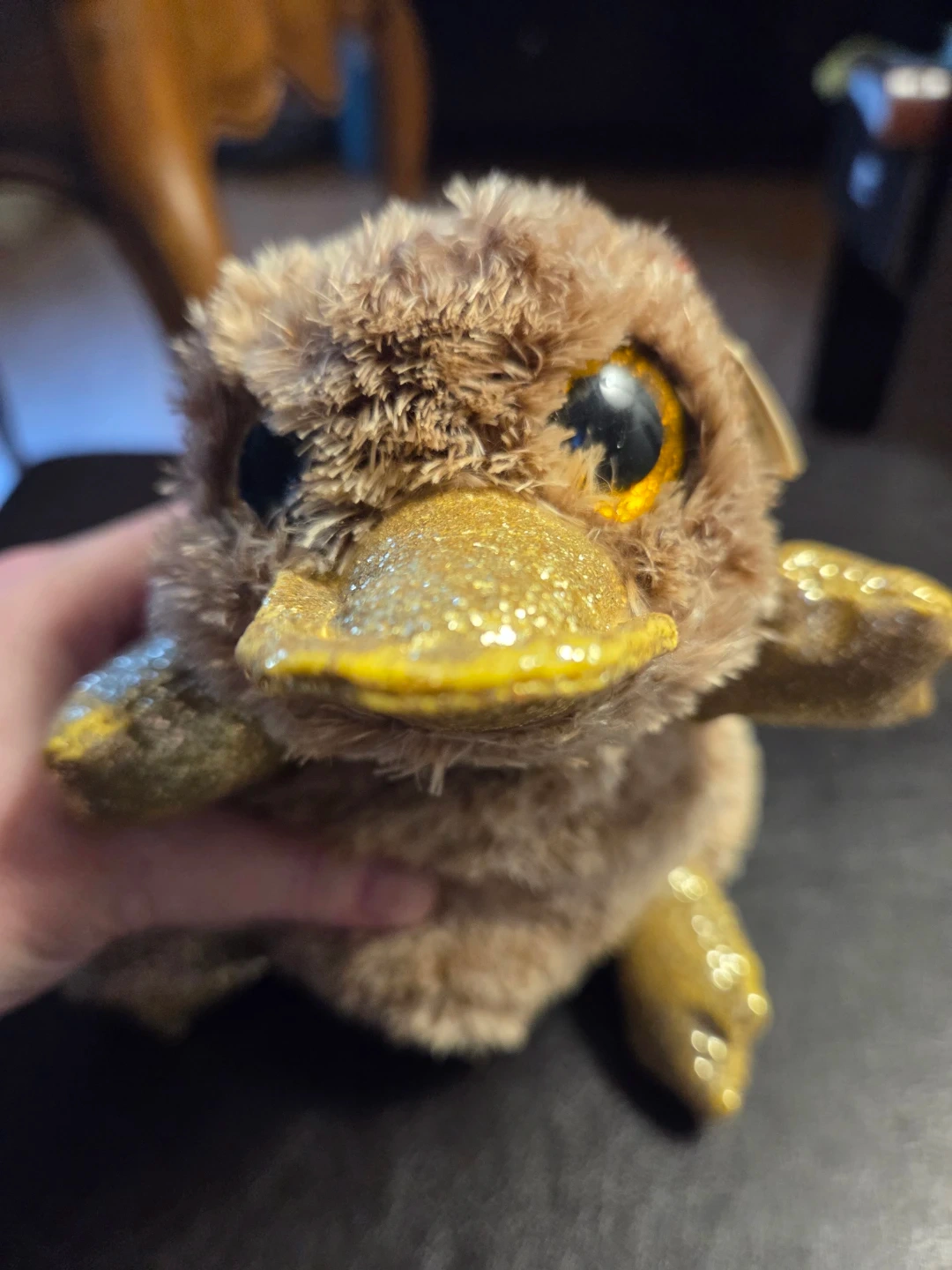 It's a fuzzy brown platypus Beanie Boo with glittery gold accents on its beak, flippers, and feet. This cute stuffed animal has big, sparkling eyes. It's perfect for collectors or as a cuddly friend!