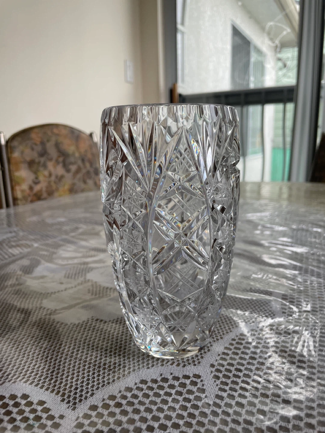 Beautifully cut glass vase with intricate diamond and fan patterns. Clear crystal material catches the light wonderfully. It's a lovely accent piece for any room.
