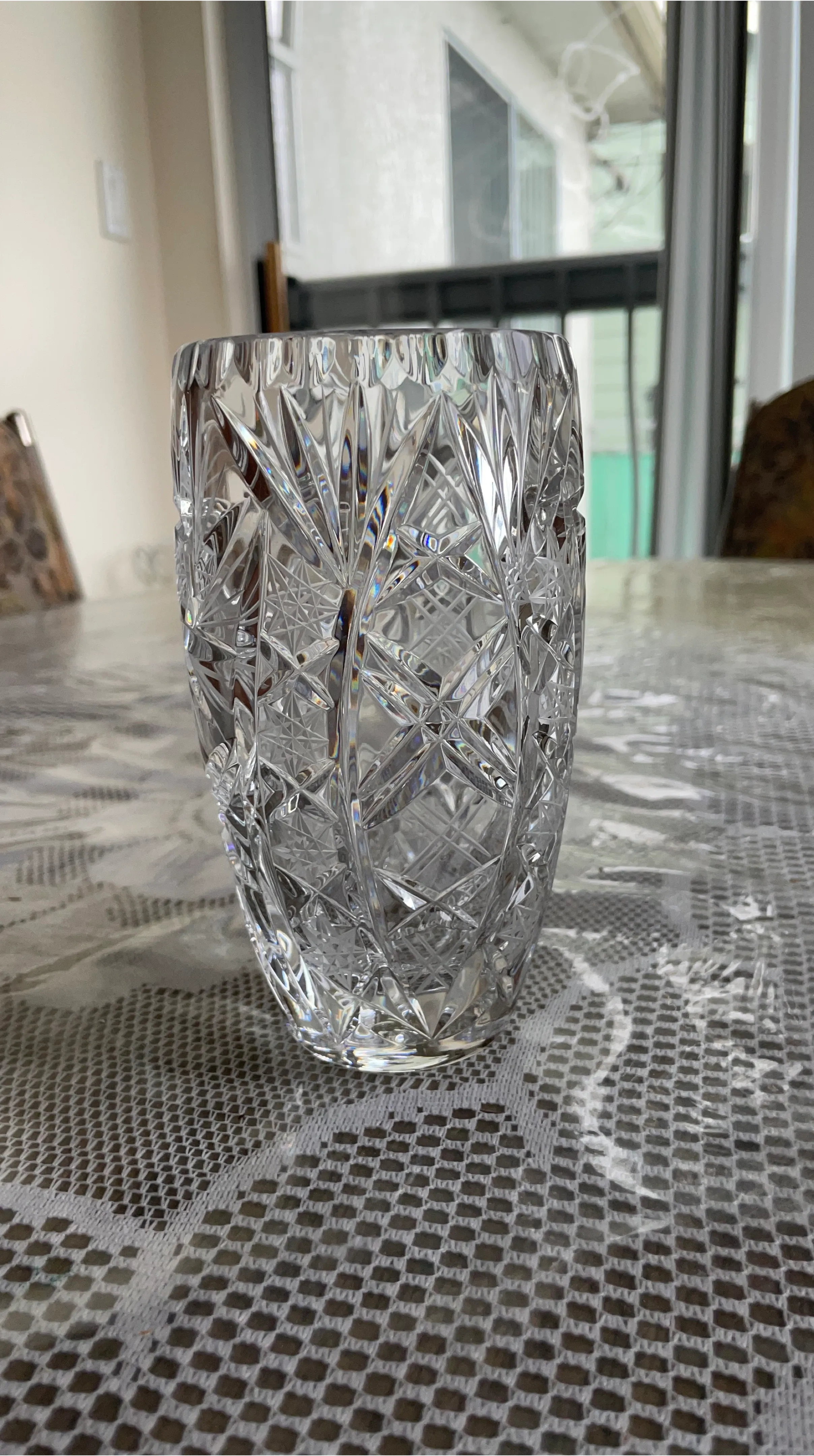 Beautifully cut glass vase with intricate diamond and fan patterns. Clear crystal material catches the light wonderfully. It's a lovely accent piece for any room.
