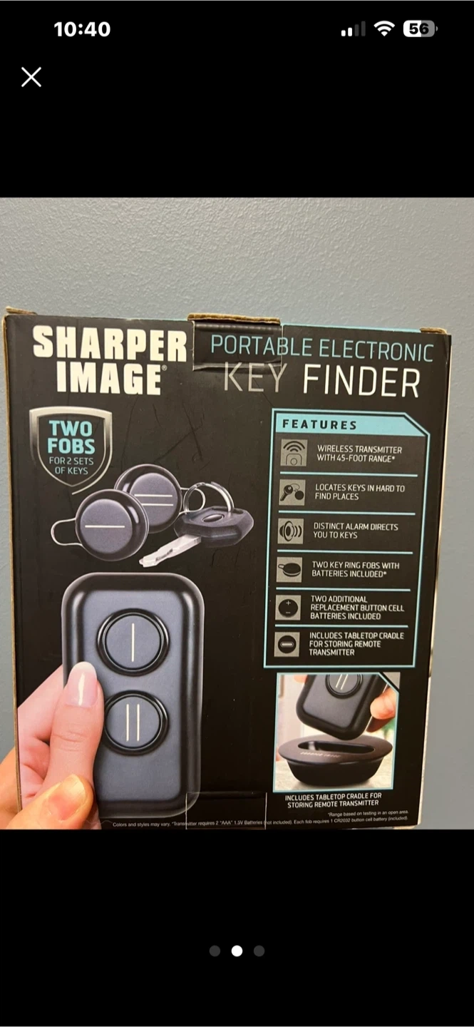 This Sharper Image key finder comes with two fobs for two sets of keys. It features a wireless transmitter with a 45-foot range. Locates keys in hard to find places and has a distinctive alarm that directs you to them. Includes a tabletop cradle for the remote transmitter.