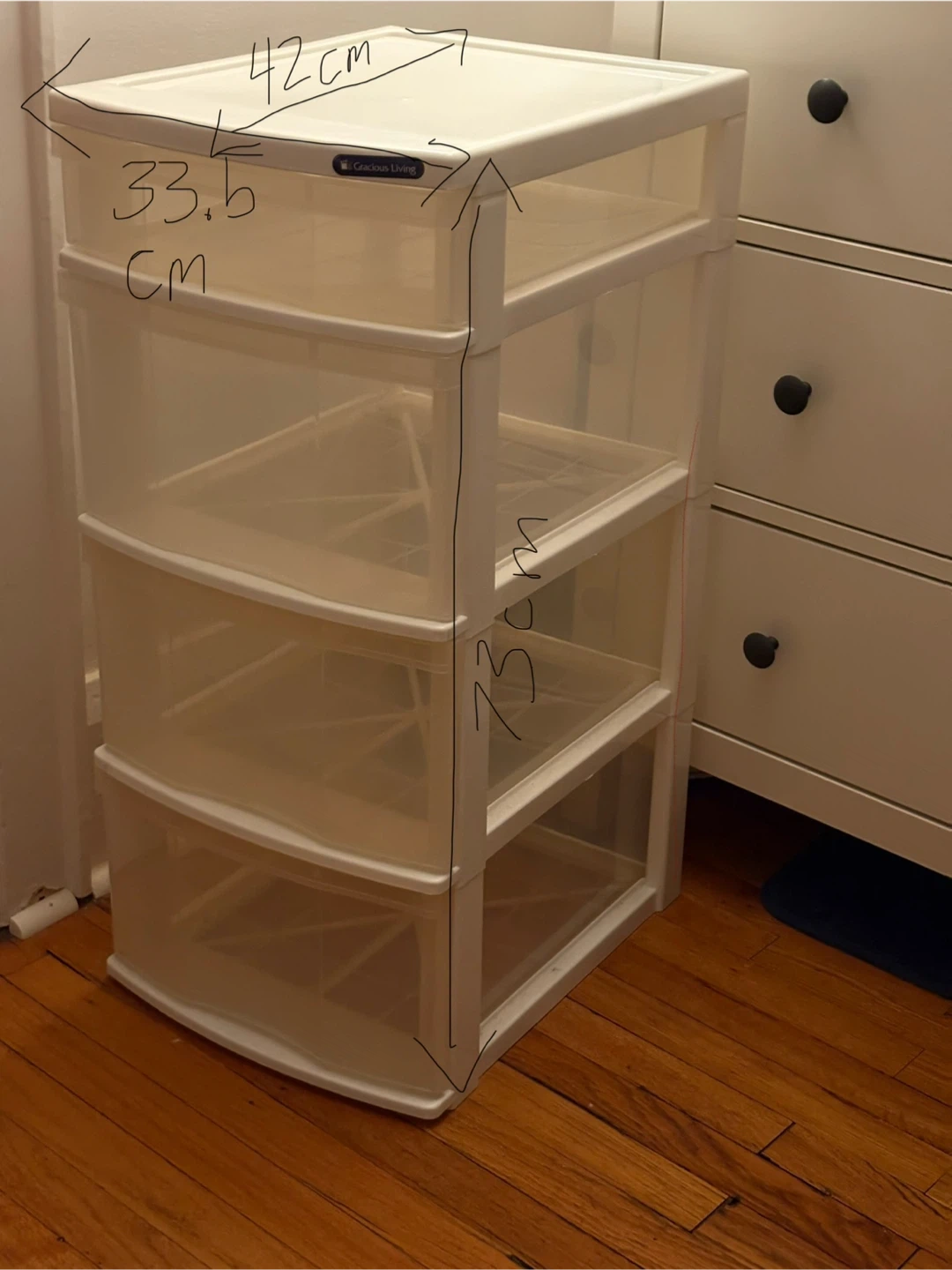 Gracious Living 4-drawer storage tower. It's perfect for organizing your space. The dimensions are approximately 42cm wide, 33.5cm deep, and 73cm tall. It's a great, lightweight solution for any room