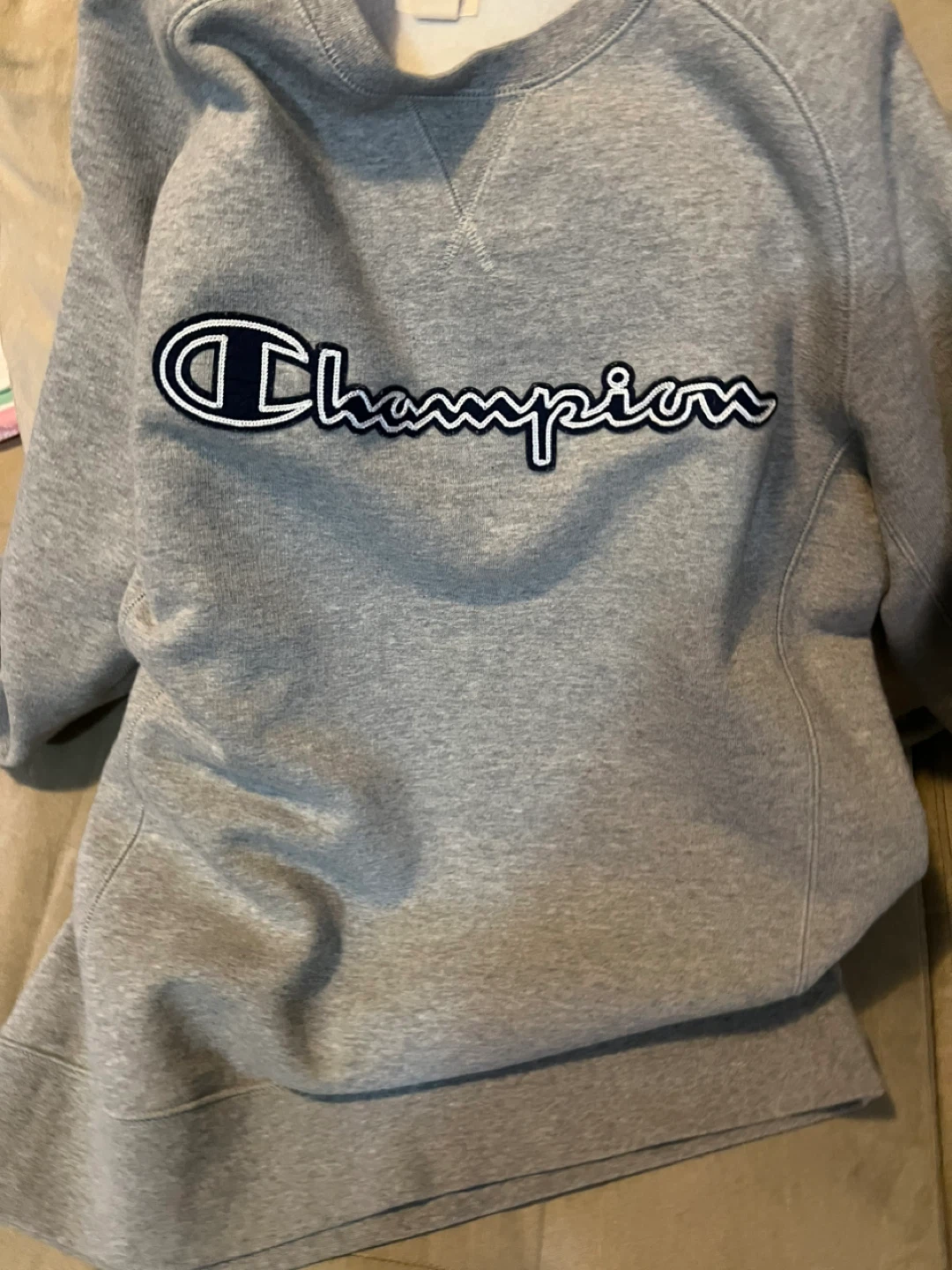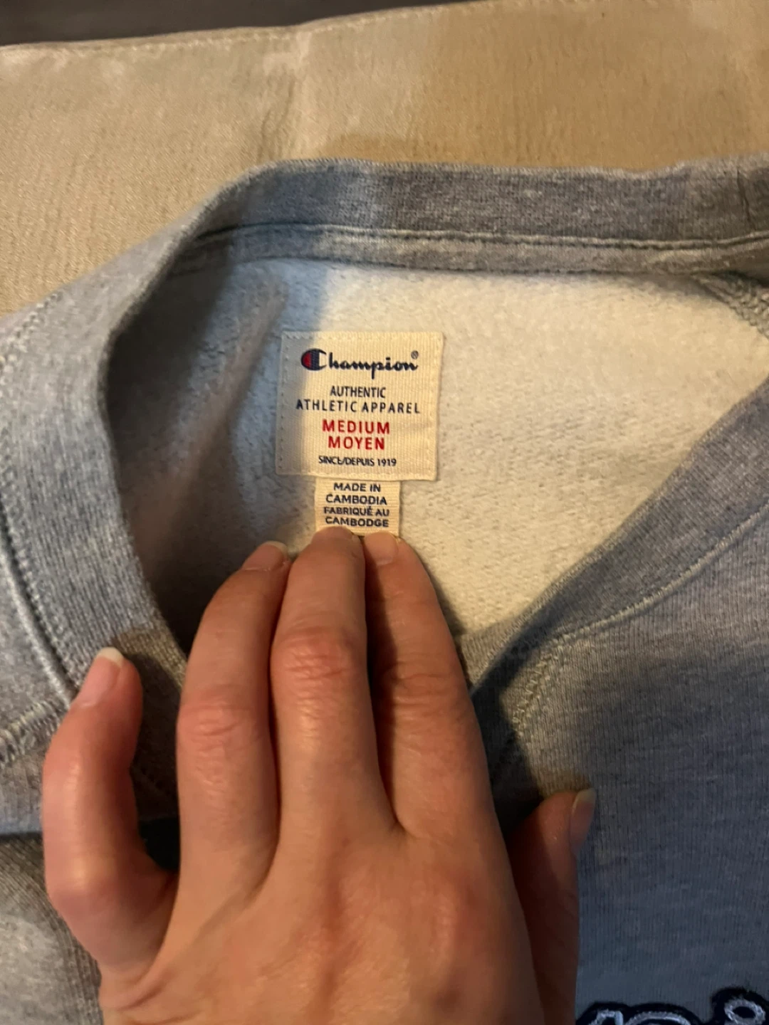 Champion authentic athletic apparel crewneck sweatshirt. Grey colour in size medium. Made in Cambodia. It has slimmers on the sides super warm and fuzzy inside