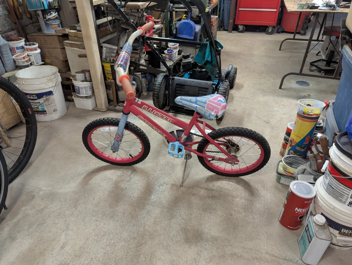This is a pink and blue Supercycle Illusion kids' bicycle. It's suitable for young riders. Features training wheels and a comfortable( need to get rid of soon)