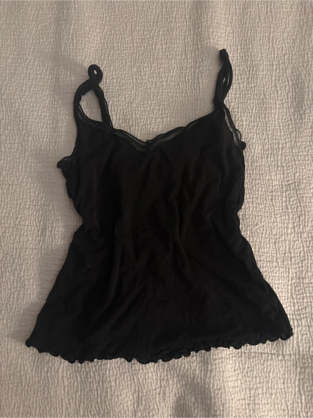 This is an ON Gossamer black cami top. It's a size medium. The material is soft and lightweight, perfect for layering or wearing on its own.