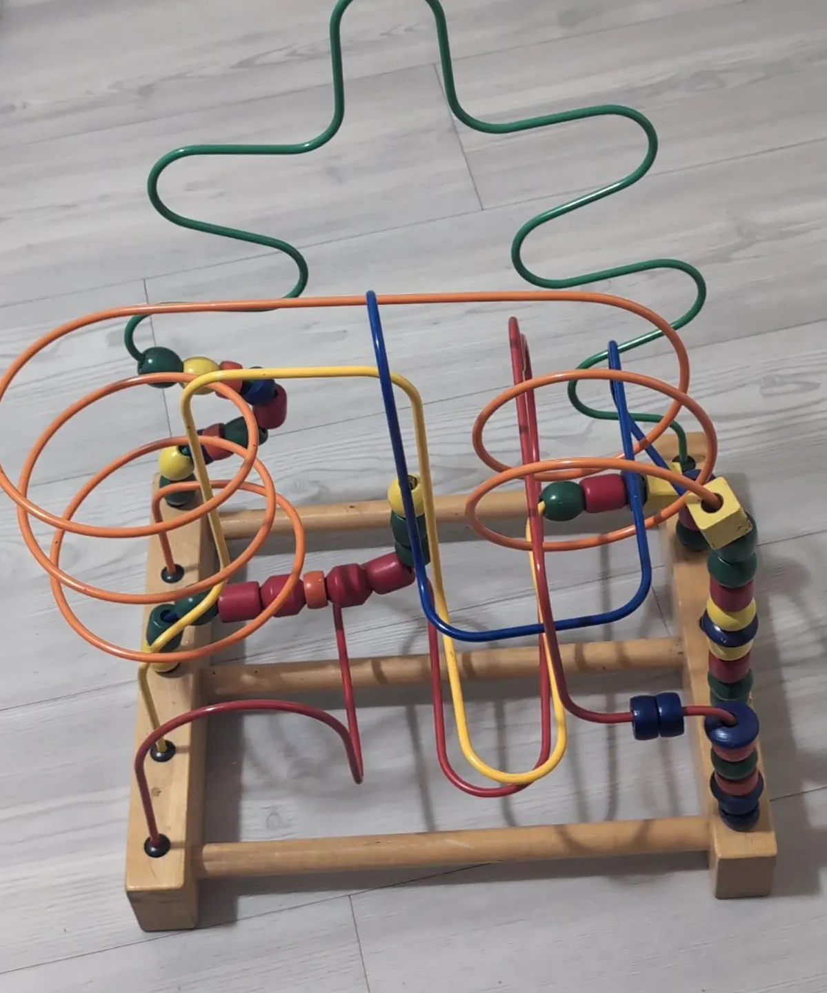 This is a fun wooden bead maze activity toy for little ones. It features colourful metal wires with beads to slide and move. The wooden frame provides a stable base for play. It's great for developing fine motor skills and hand-eye coordination.