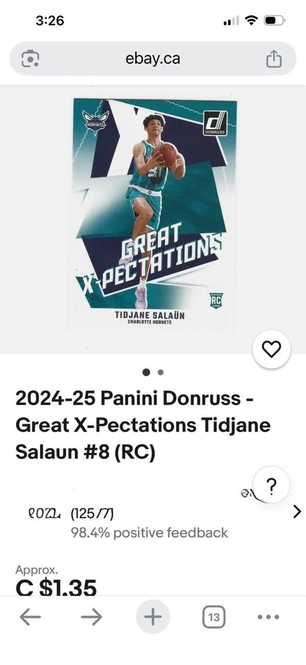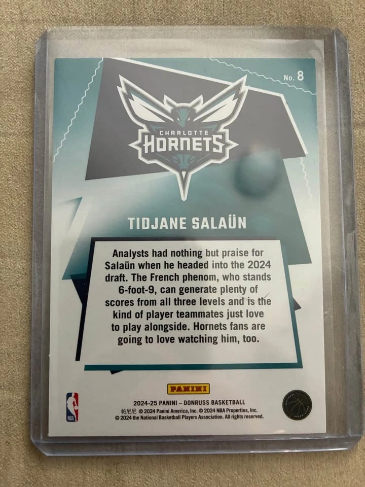 This is a 2024-25 Donruss "Great X-Pectations" rookie card of Tidjane Salaün, who plays for the Charlotte Hornets. It is a rookie (RC) card and features the Charlotte Hornets team logo. The card is part of the "Great X-Pectations" subset of the Donruss collection. The card shows Salaün in a teal and purple uniform, dribbling a basketball. Feel free to message if you have any questions!