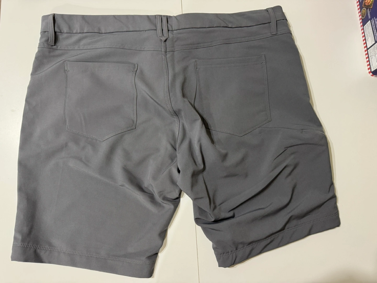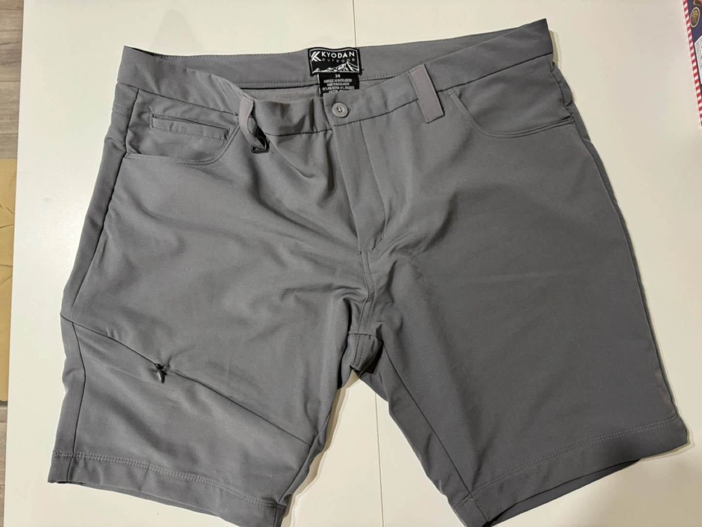 71Men's outdoor shorts. Grey colour. Size 34. Multiple pockets. Made in Bangladesh. 92% polyester, 8% spandex.