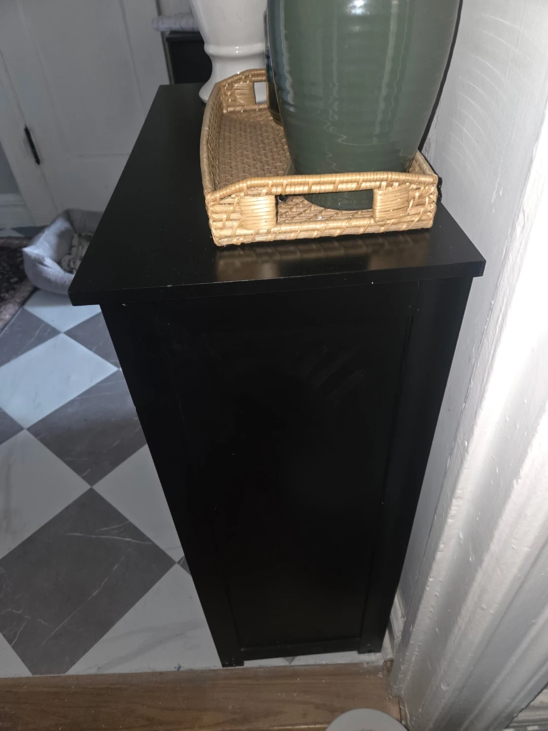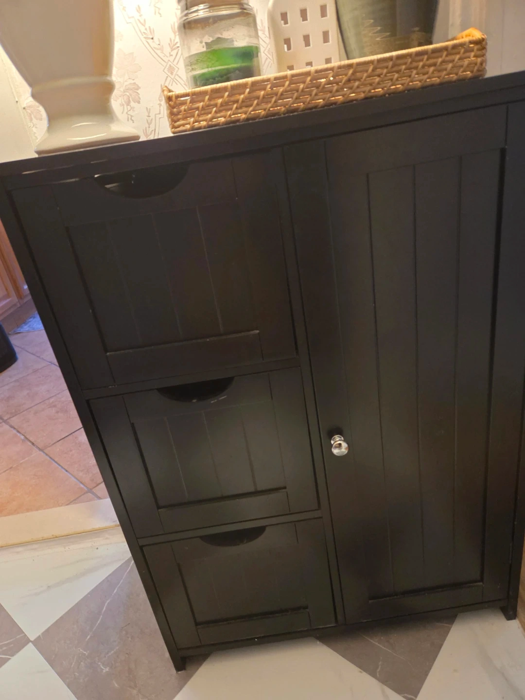 This dark brown storage cabinet offers versatile storage options. It features three drawers on the left and a single door on the right. Its slatted design adds a touch of style to any room.