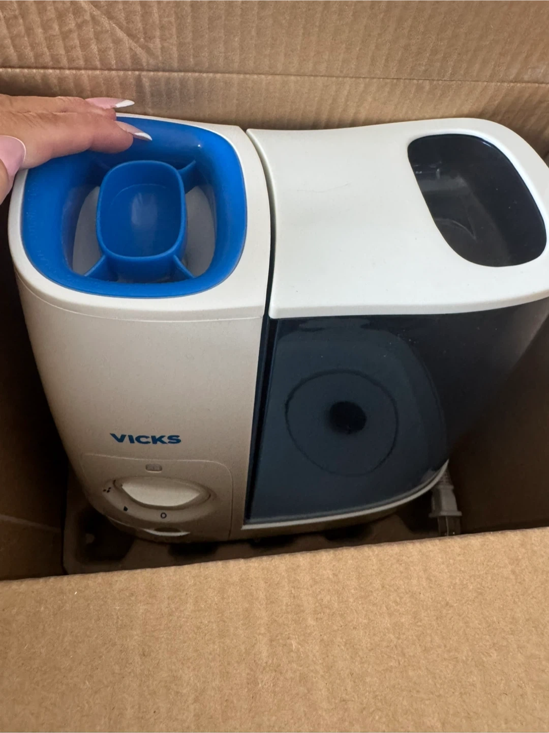 Vicks warm mist humidifier in white and blue. Comes with original packaging. Designed to provide soothing steam for coughs and congestion.