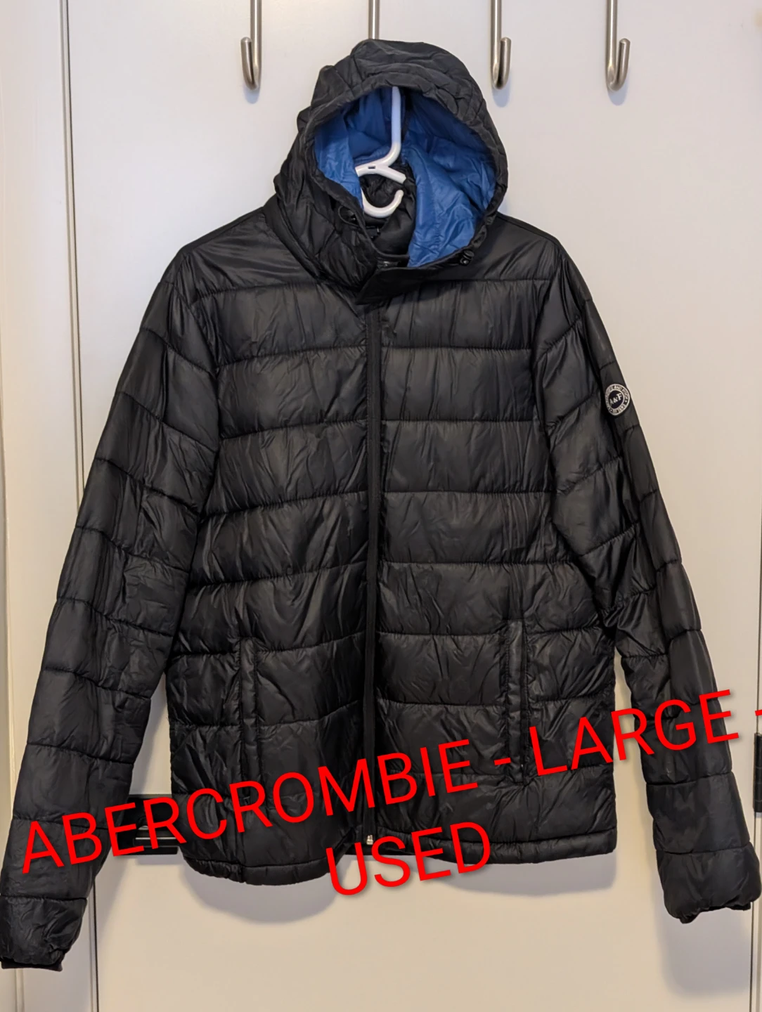Selling a black puffer jacket from Abercrombie in size large. It's in used condition but still has lots of life left. Perfect for staying warm this winter!
