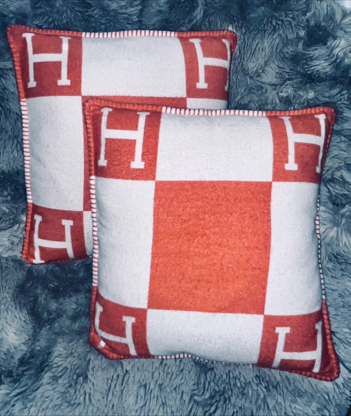 Selling a set of two Hermès Avalon III throw pillows. These are in great condition and feature the iconic "H" design. The colours are a lovely combination of orange and white. They would make a stylish addition to any living space