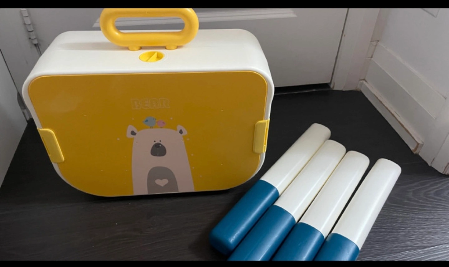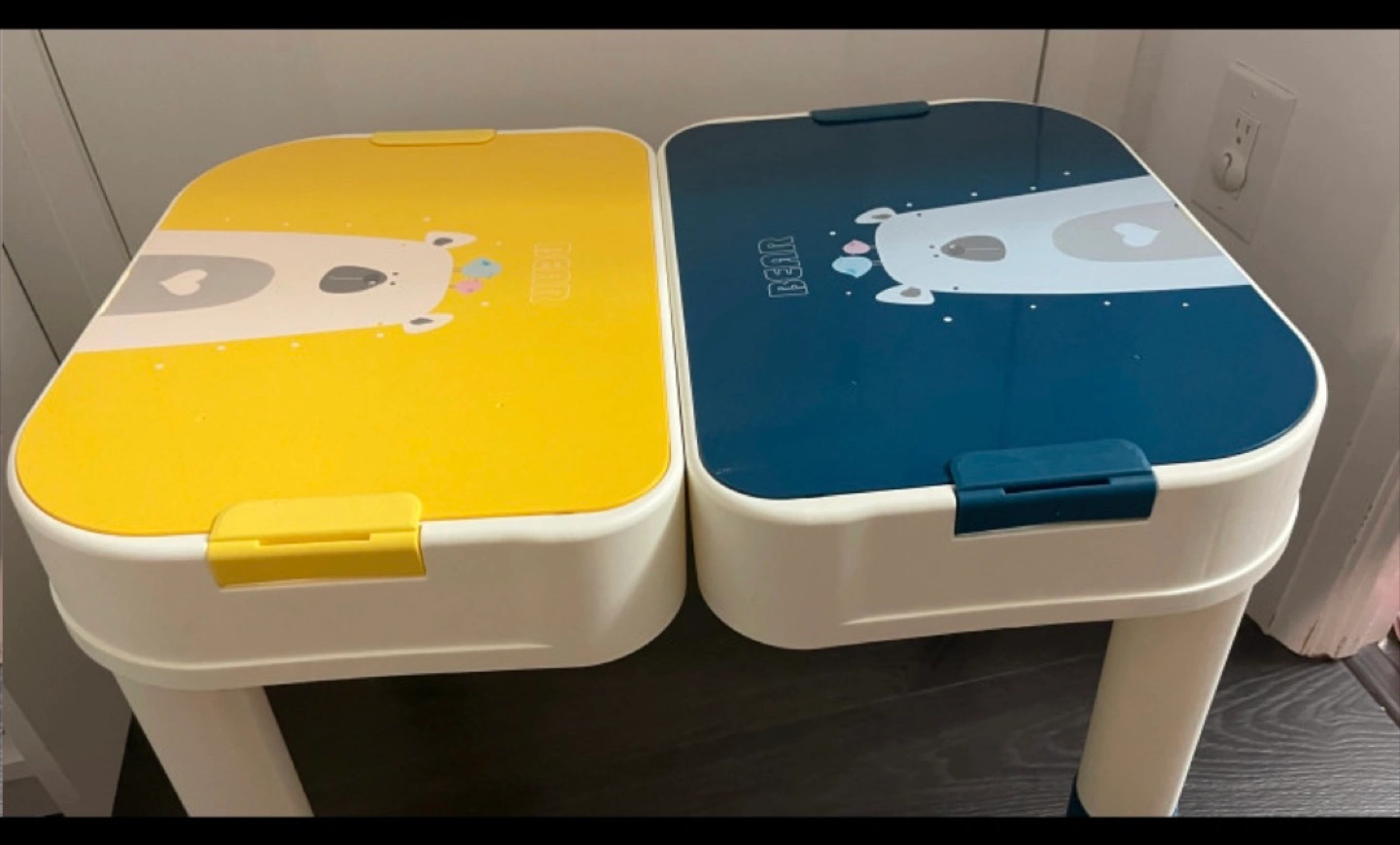 Two children's LEGO storage tables. Yellow and blue. Features a LEGO-compatible surface and storage compartment. Adorable bear design. Easy assembly.