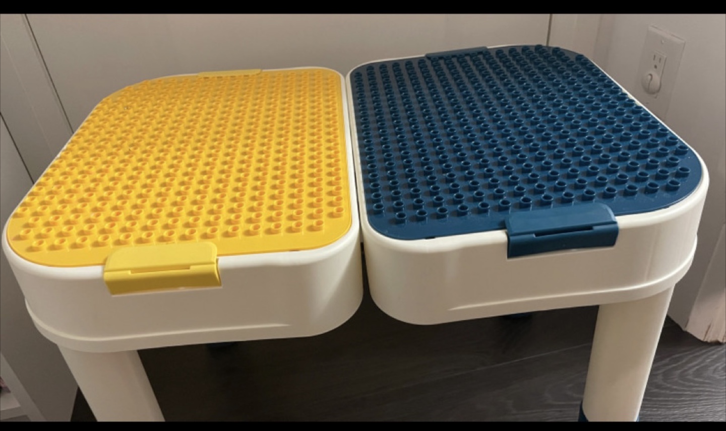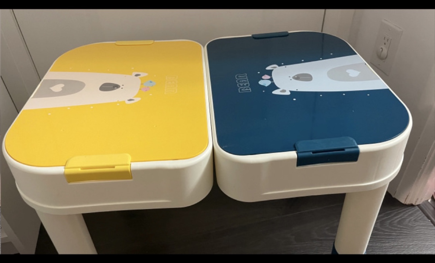 Two children's LEGO storage tables. Yellow and blue. Features a LEGO-compatible surface and storage compartment. Adorable bear design. Easy assembly.