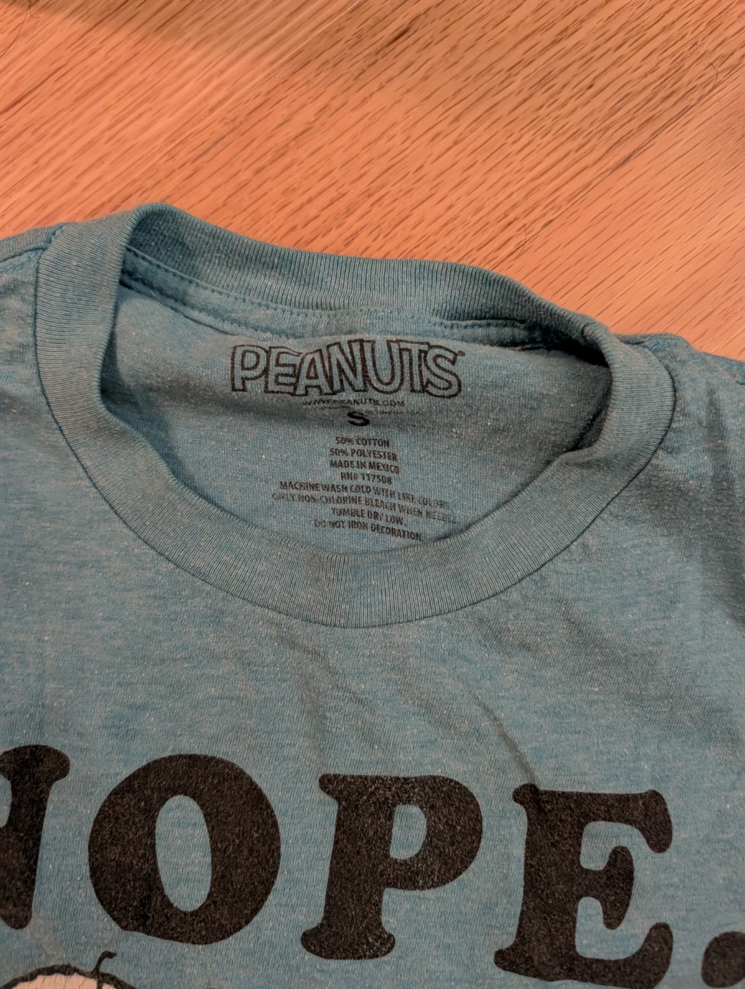 This is a Peanuts t-shirt featuring Snoopy. It's made of 50% cotton and 50% polyester. Machine wash cold, tumble dry low. Do not iron decoration.