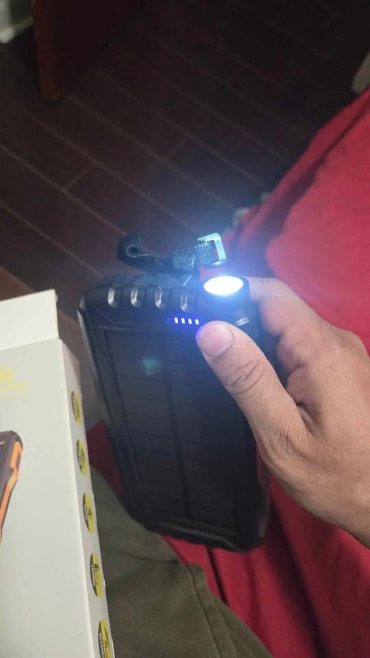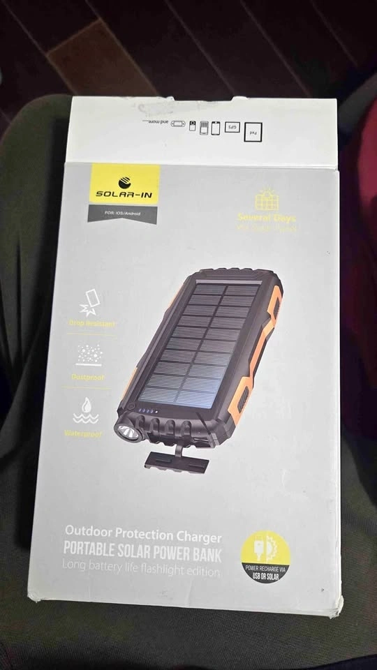 Portable solar power bank with a rugged design that is drop resistant, dustproof, and waterproof. It has a built-in flashlight. You can charge it via USB or solar. Works with both iOS and Android devices. Great for camping or emergency situations.