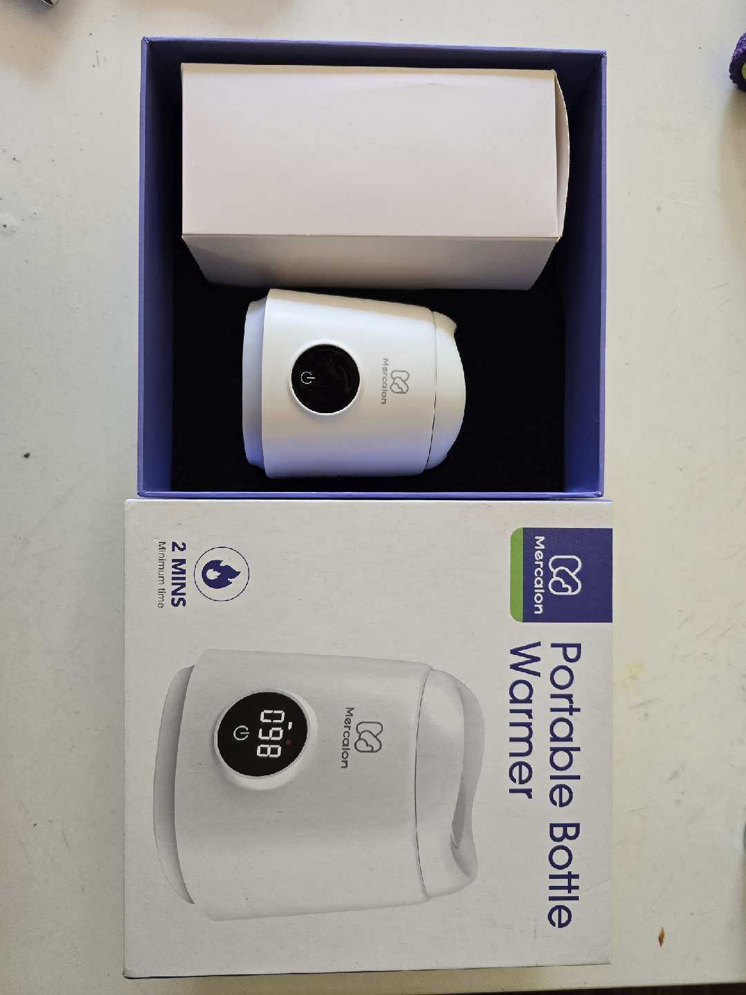 Selling Mercalon portable bottle warmer, still in its original box! It's super convenient for warming bottles on the go. It heats up in just 2 minutes, making it quick and easy to use. Perfect for parents needing a reliable and portable solution for feeding time.