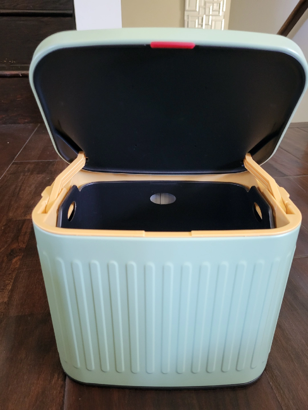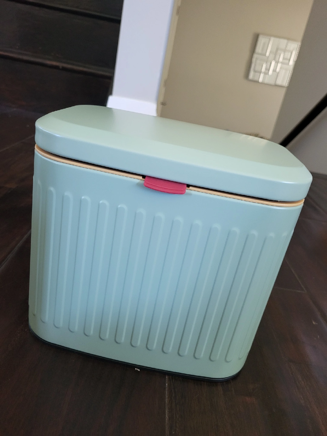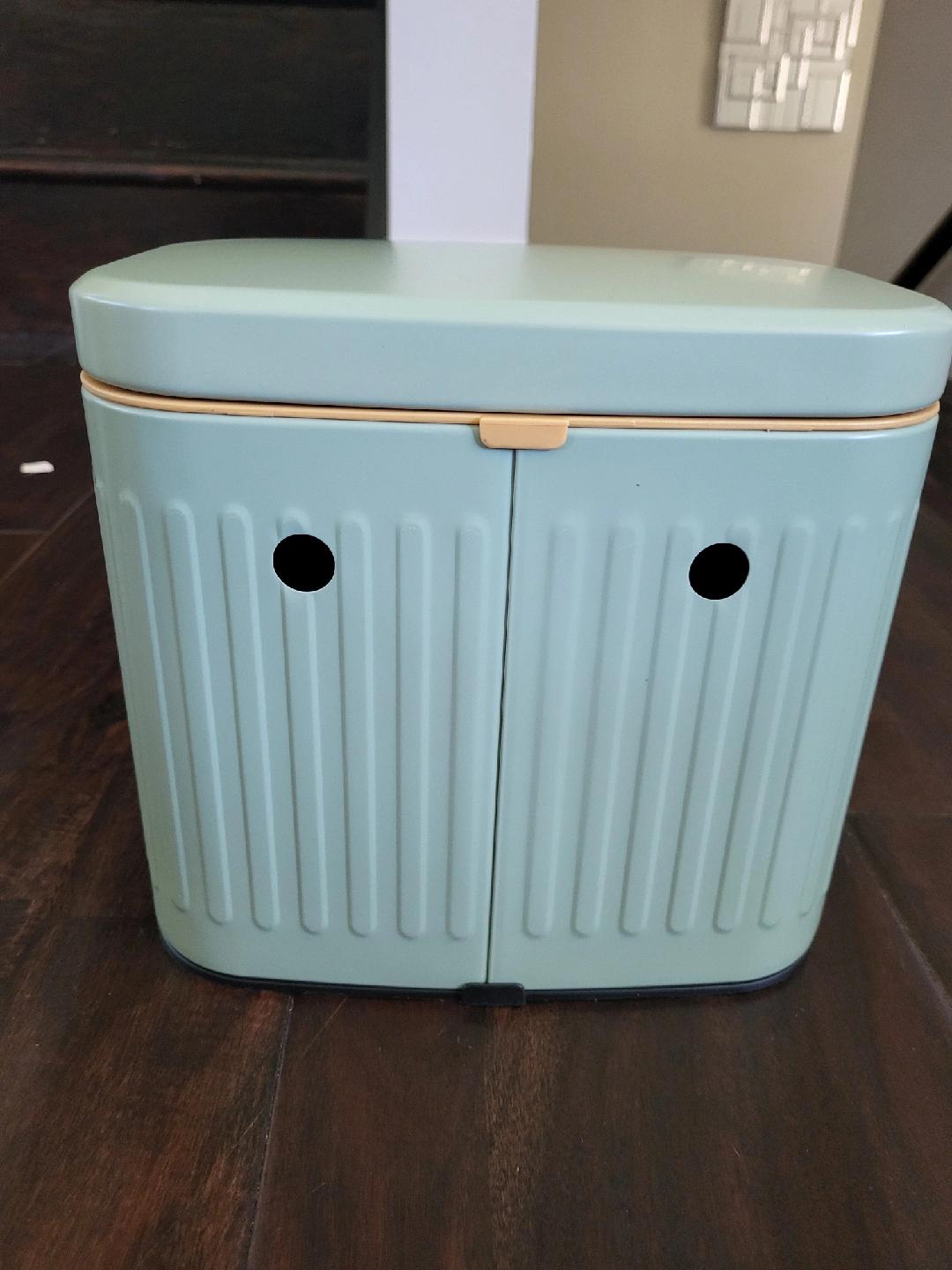 Selling a mint green trash can, perfect for small spaces like bathrooms or kitchens! It's brand new in packaging, and ready for a new home. Wall mountable. $25, pu from Cambridge.