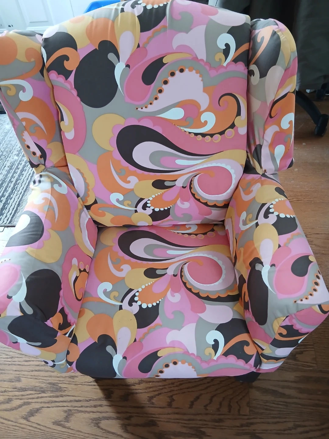 This child's armchair features a vibrant, eye-catching psychedelic swirl pattern in pinks, oranges, grays, and browns. It's upholstered and offers comfortable seating. This chair is a fun statement piece for any room!