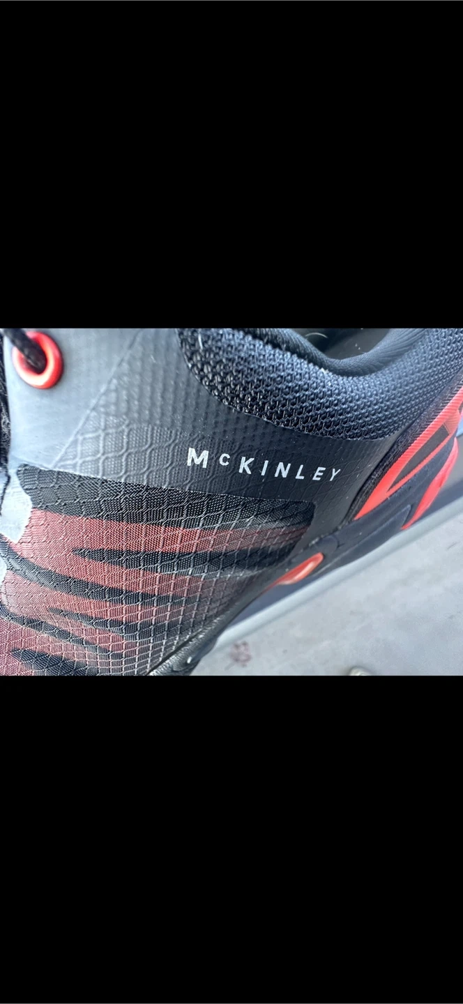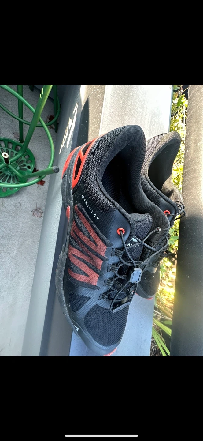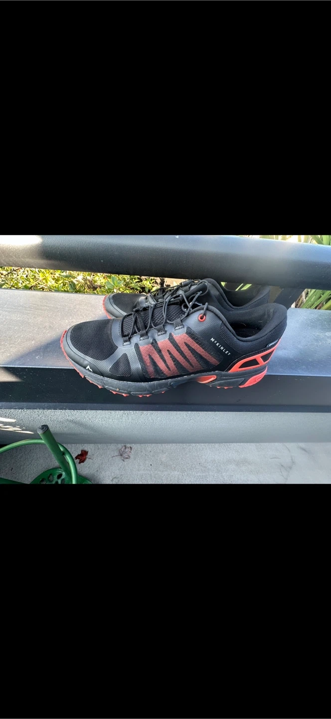 These are black and red McKinley trail running shoes. They feature a durable mesh upper and a rugged rubber sole for excellent grip. Perfect for hitting the trails!