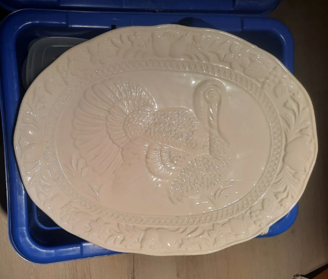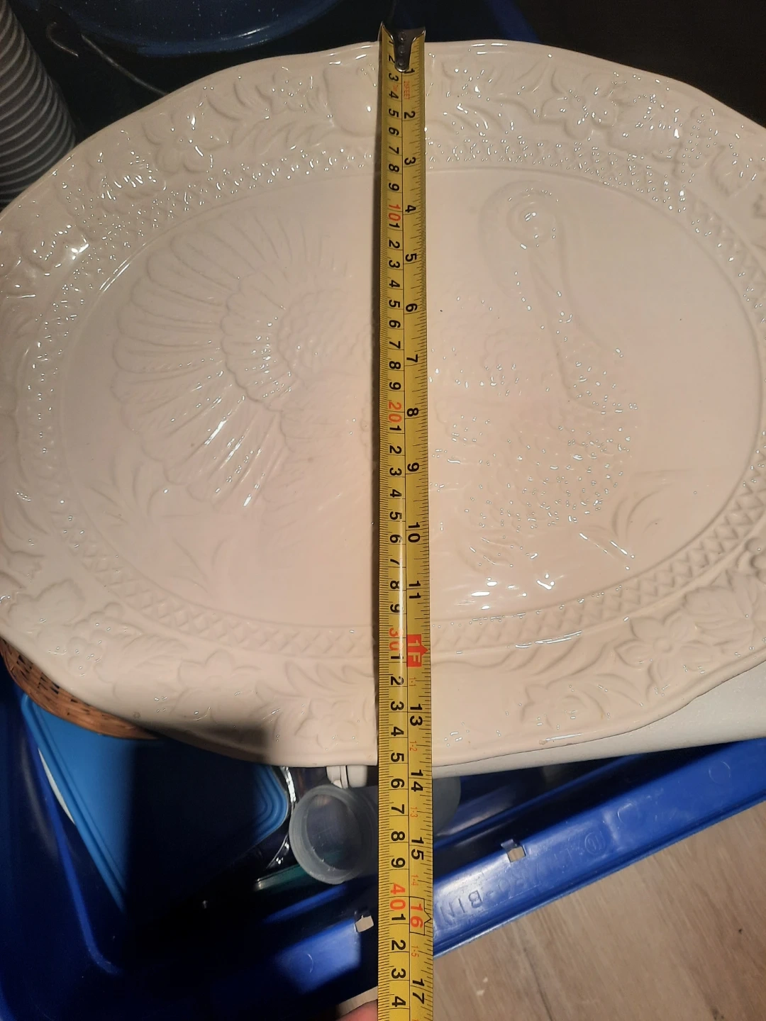 Selling a Vintage Oval Turkey Platter. It measures approximately 18 inches in length. Ceremic with embossed design. Perfect for serving up your holiday meals!