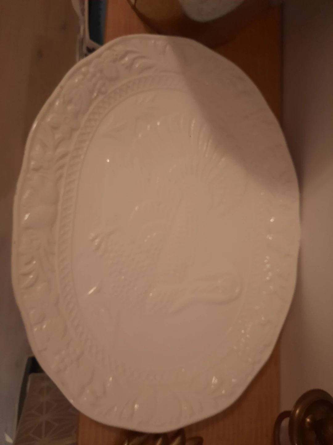 Selling a Vintage Oval Turkey Platter. It measures approximately 18 inches in length. Ceremic with embossed design. Perfect for serving up your holiday meals!