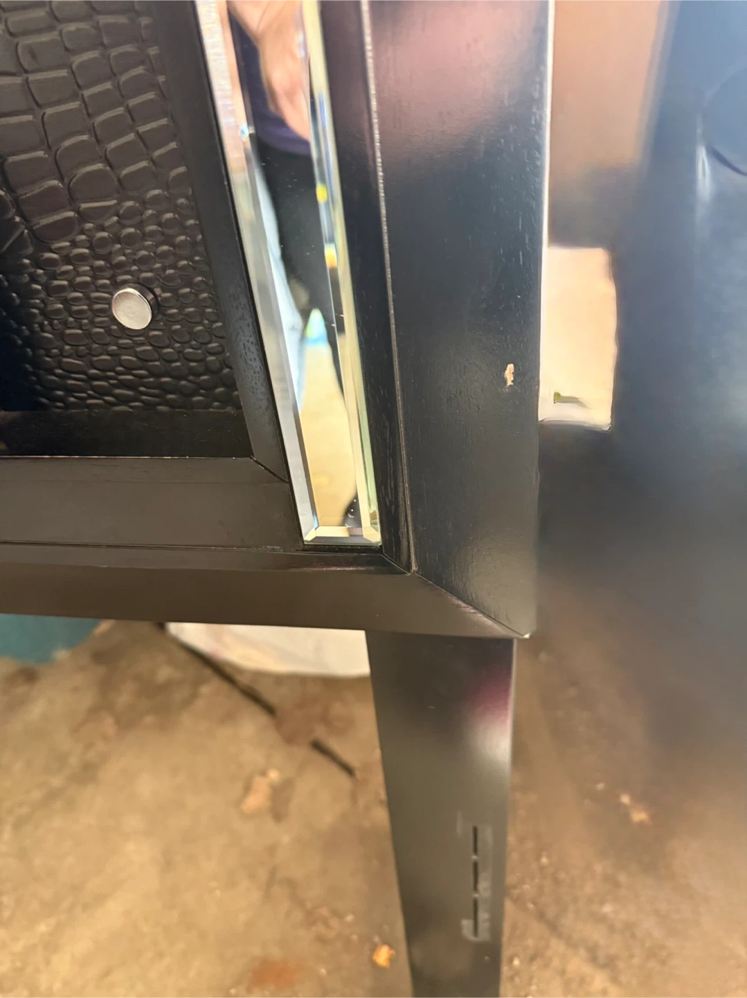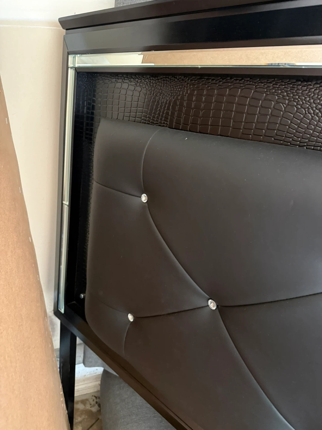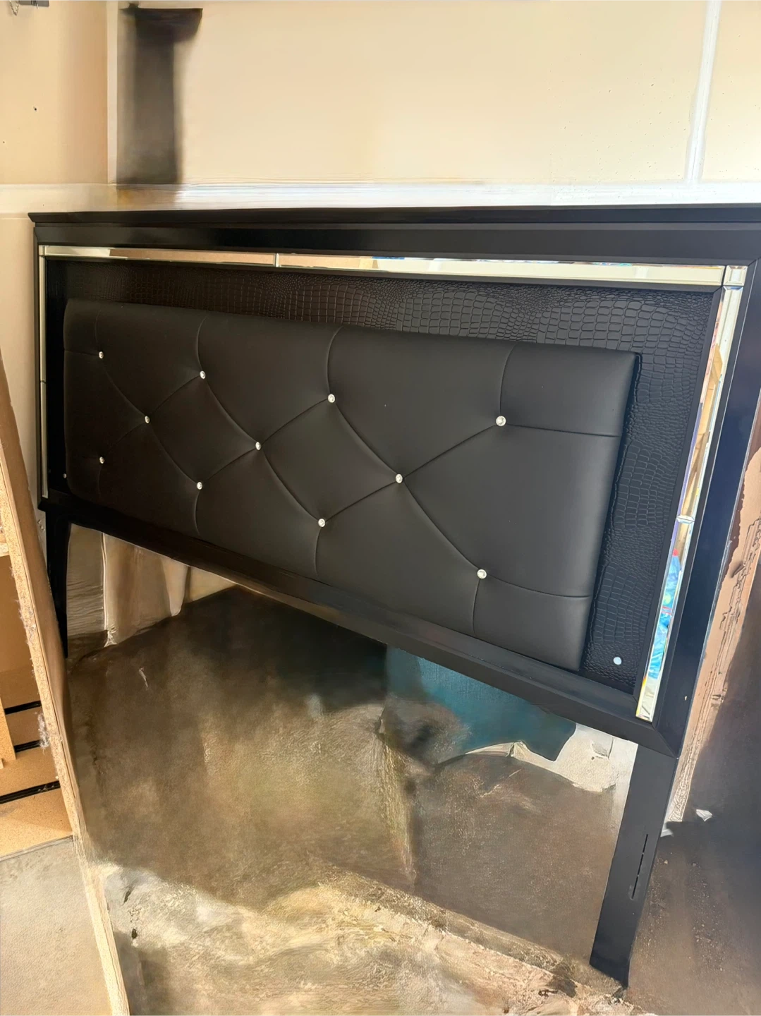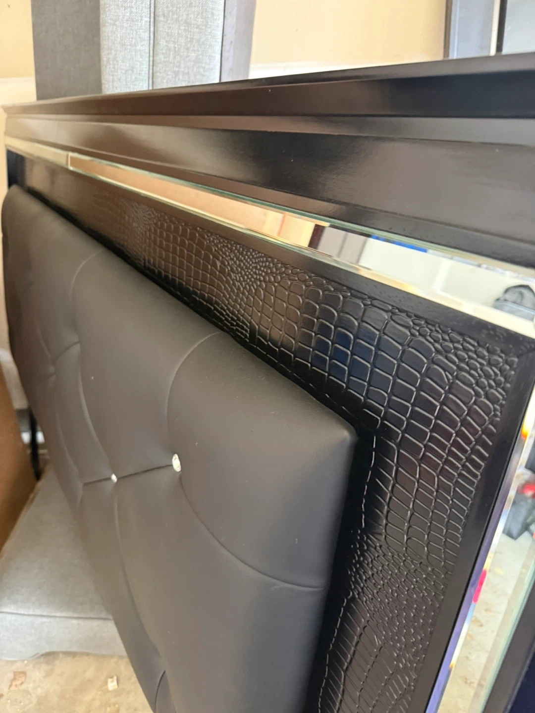 This stylish black headboard features a diamond-tufted faux leather panel with crystal accents. It has a textured faux alligator skin trim and mirrored accents along the sides. And lights up! It's designed for a king-sized bed frame.