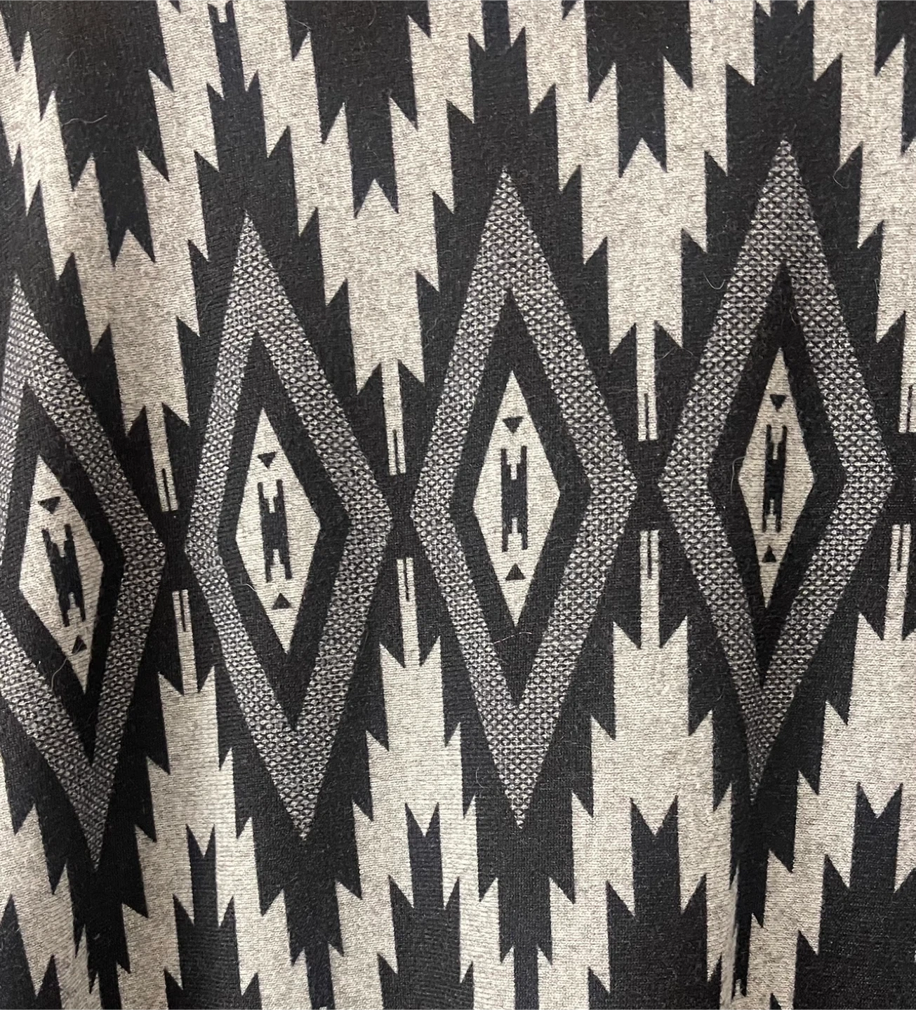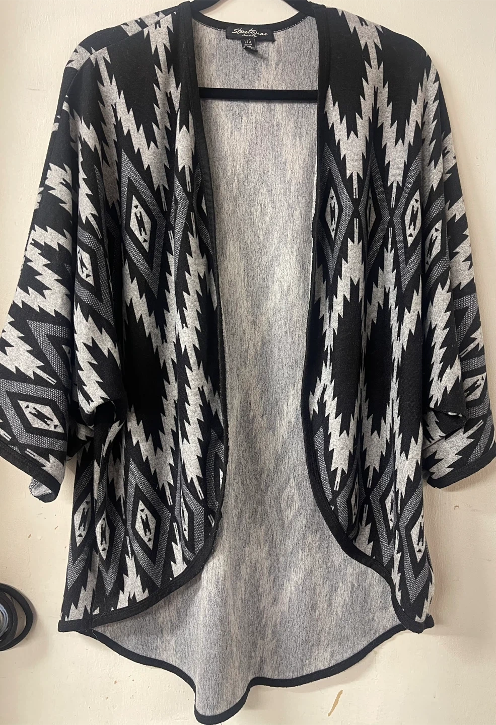 This cardigan features a black and grey geometric pattern. The material is a soft knit fabric. 3/4 length sleeve.