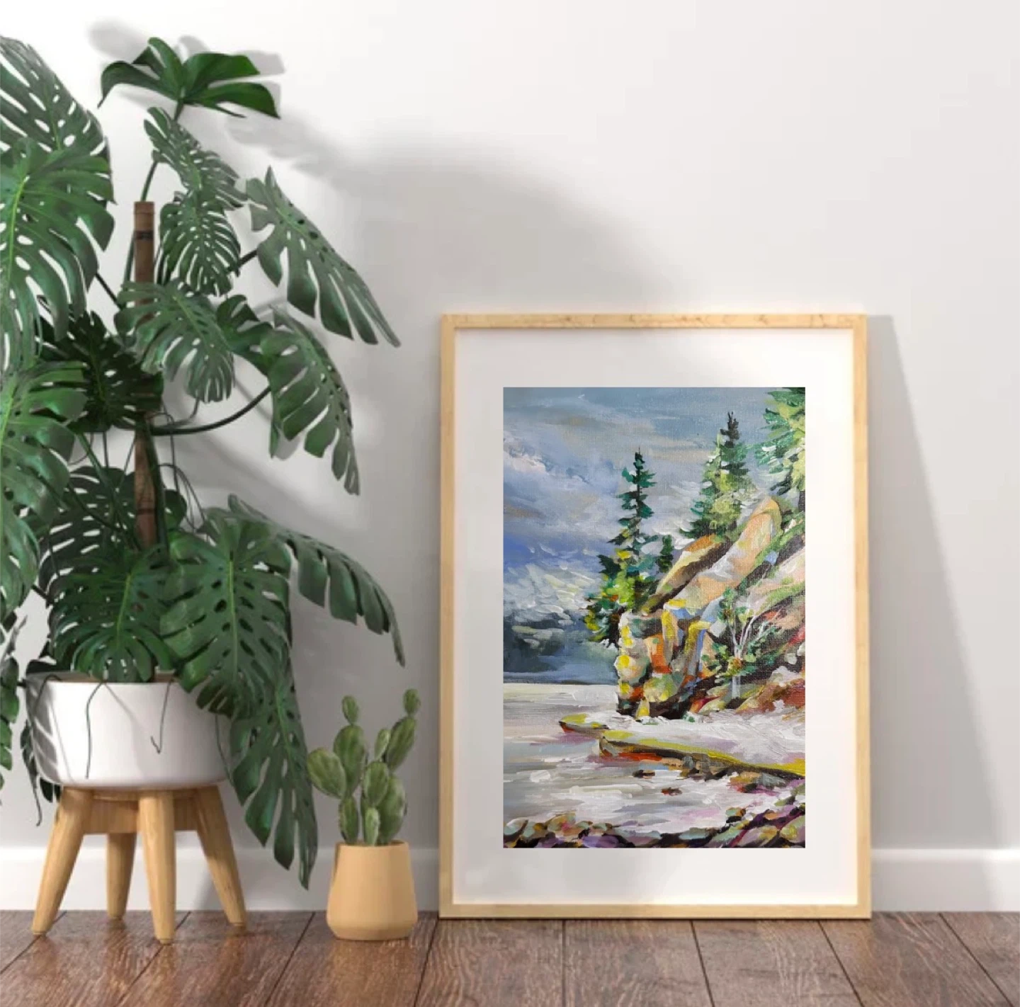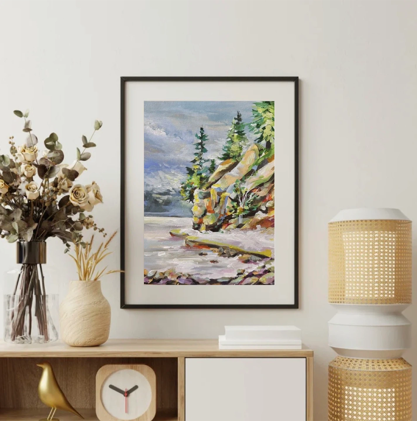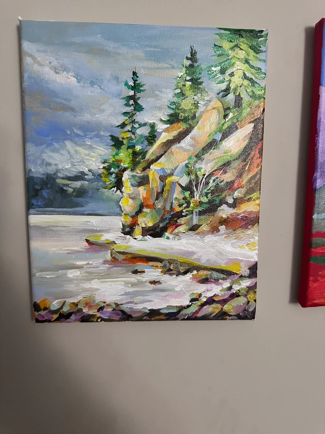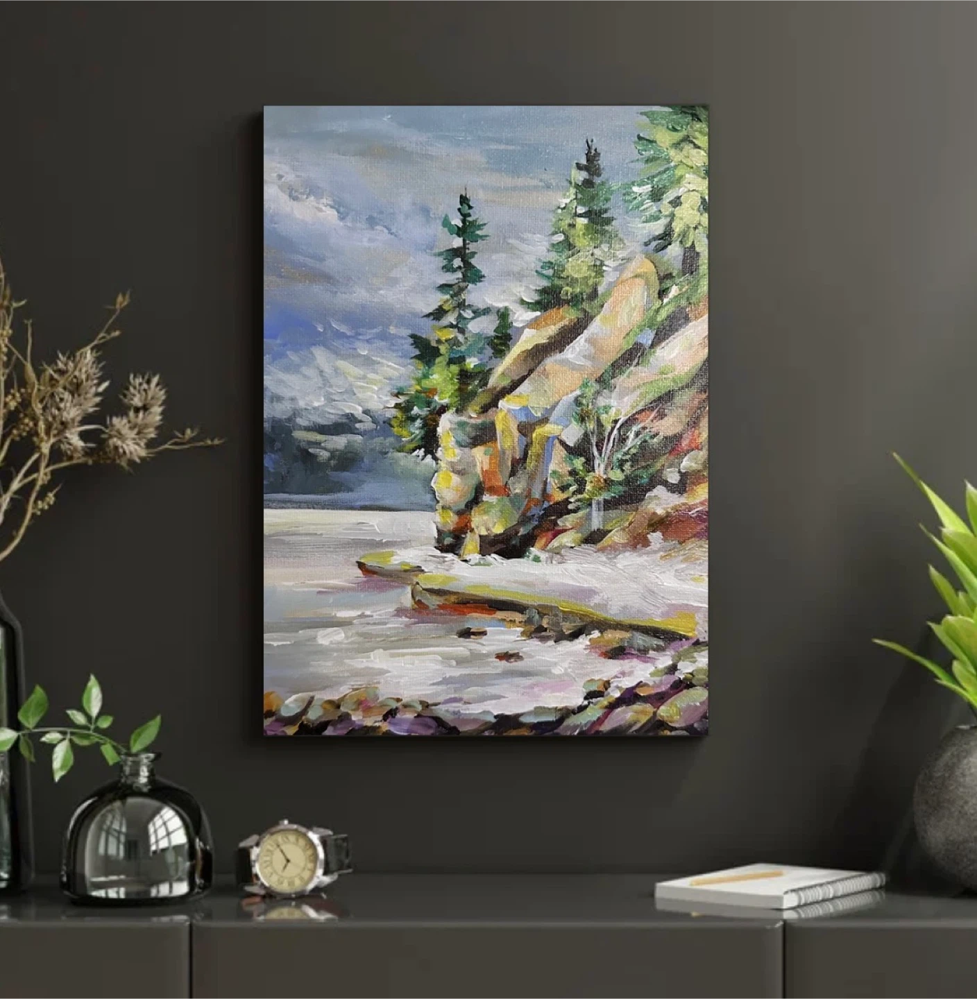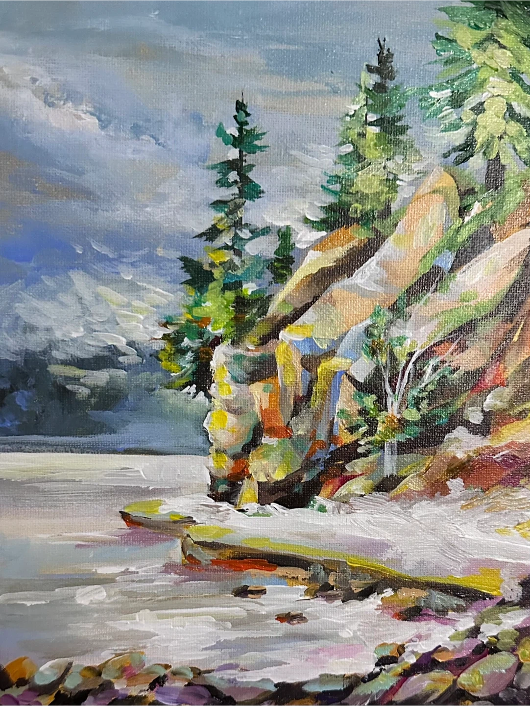 This original acrylic painting captures the quiet beauty of a winter landscape. Snow gently covers the rocky shoreline while evergreen trees rise above the cliffs, creating a peaceful and timeless atmosphere.