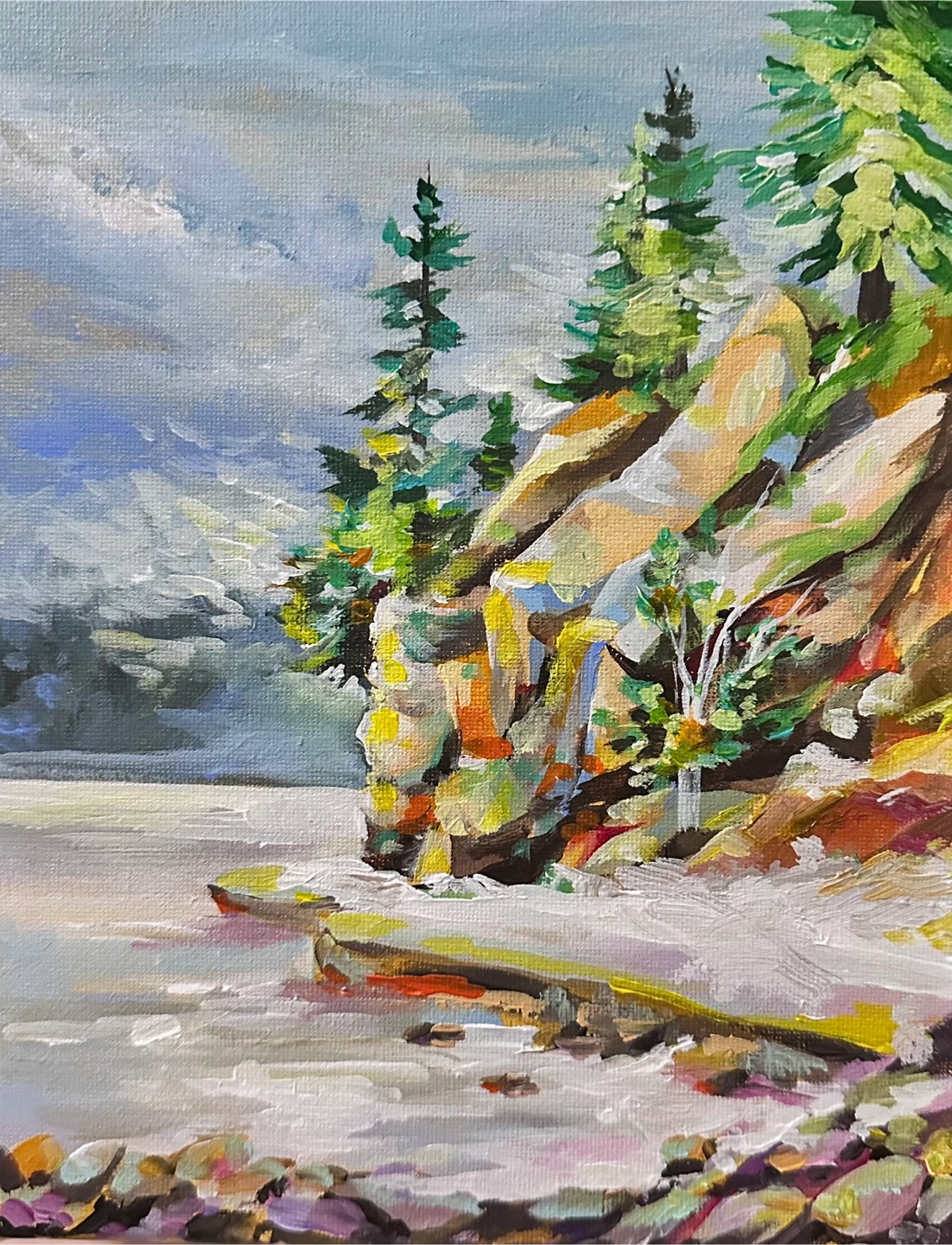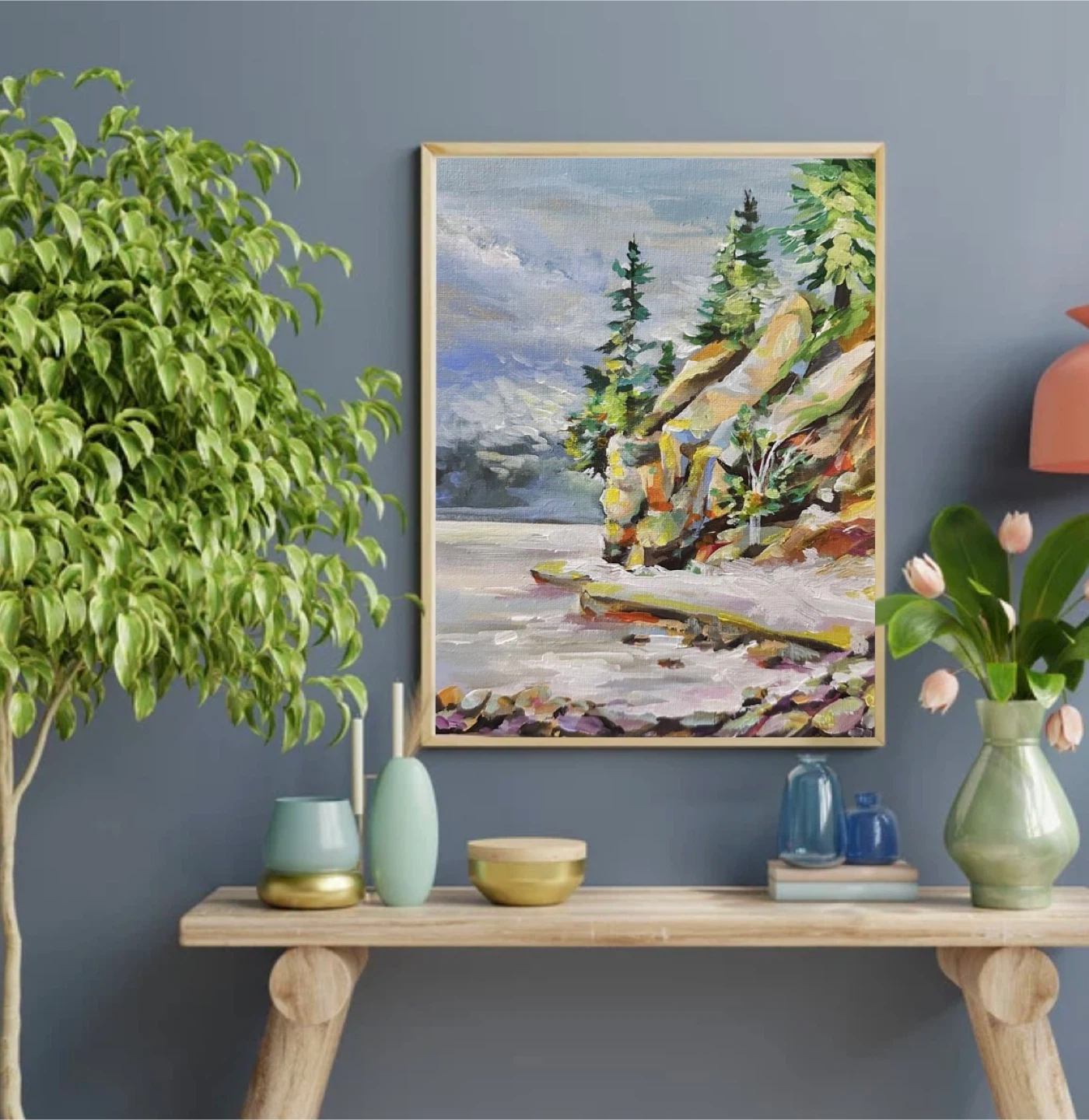 This original acrylic painting captures the quiet beauty of a winter landscape. Snow gently covers the rocky shoreline while evergreen trees rise above the cliffs, creating a peaceful and timeless atmosphere.