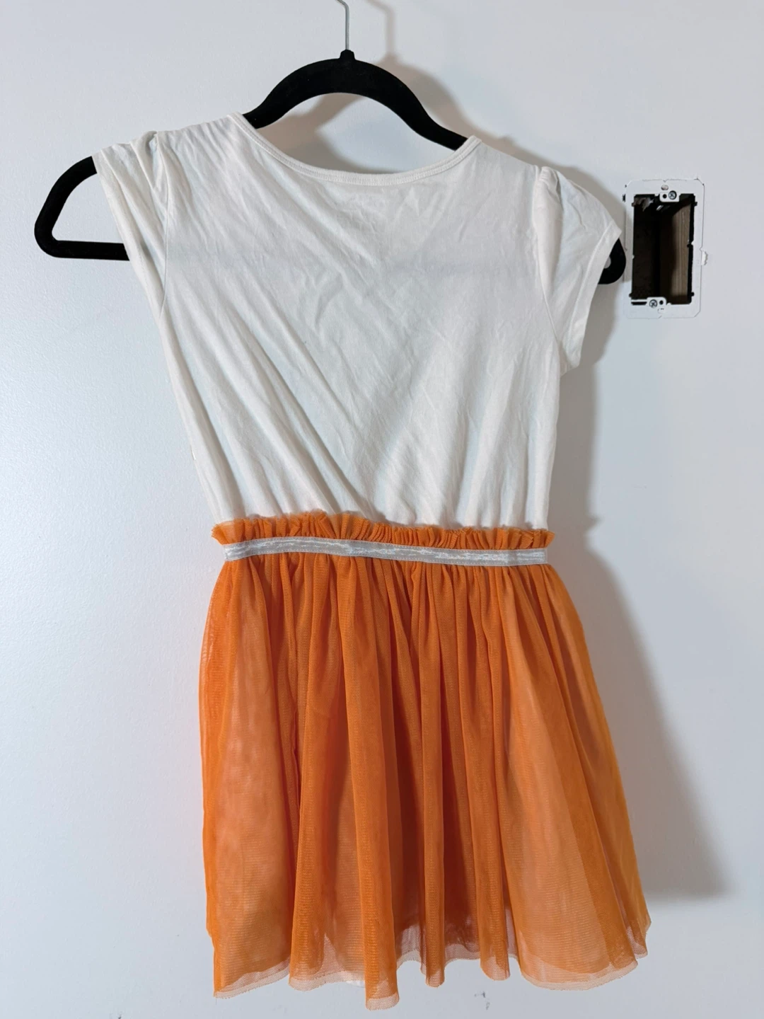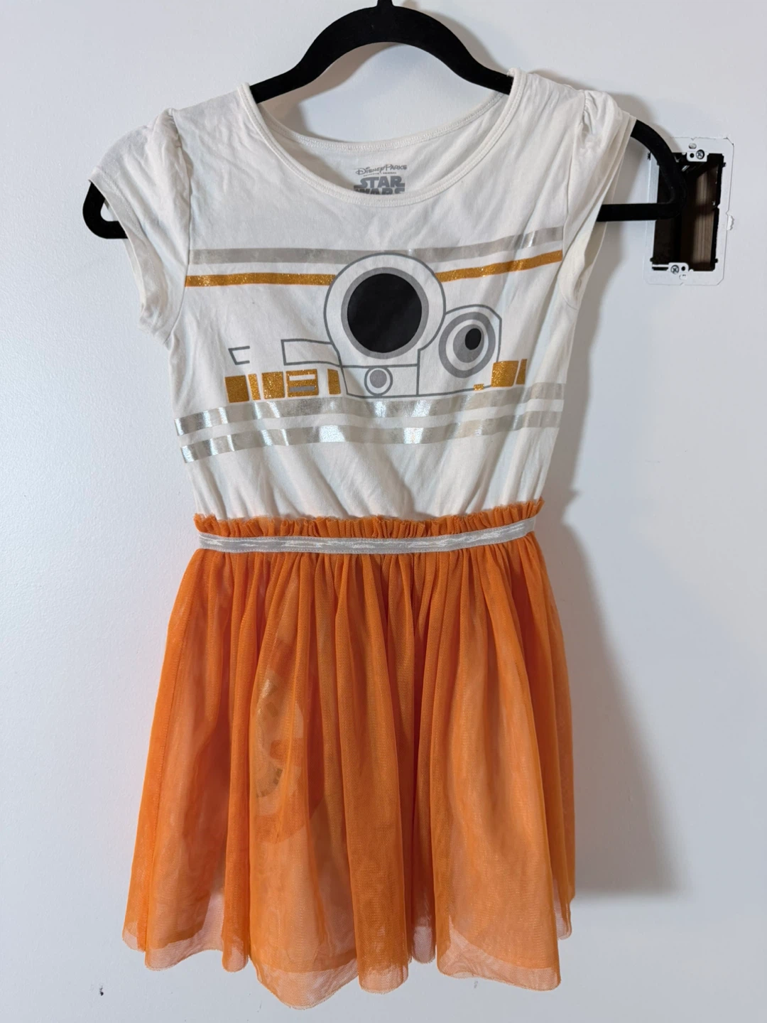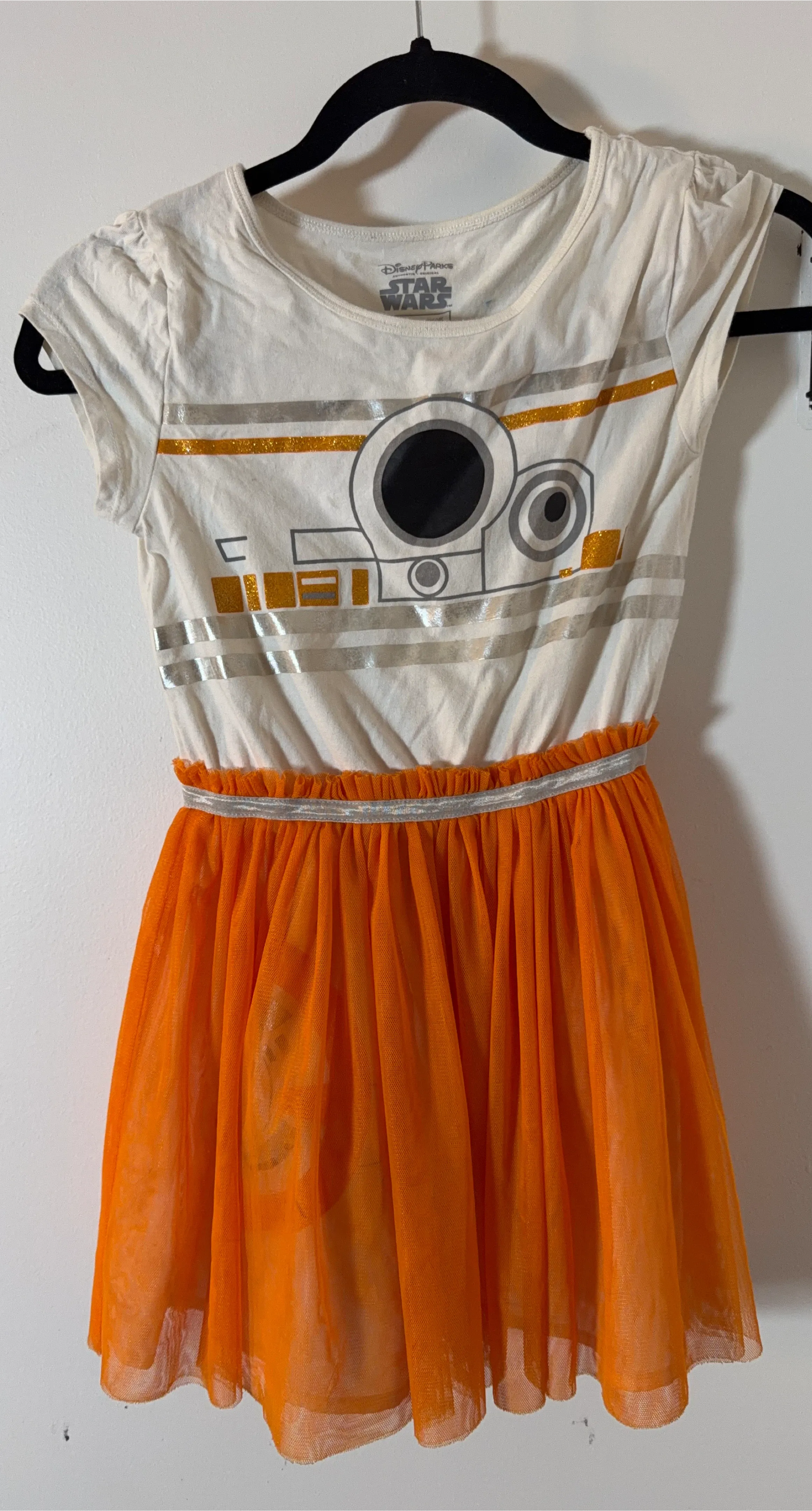 White t-shirt dress with a BB-8 graphic on the front. It has an orange tulle skirt with a silver elastic waistband. Officially licensed Star Wars merchandise from Disney Parks.