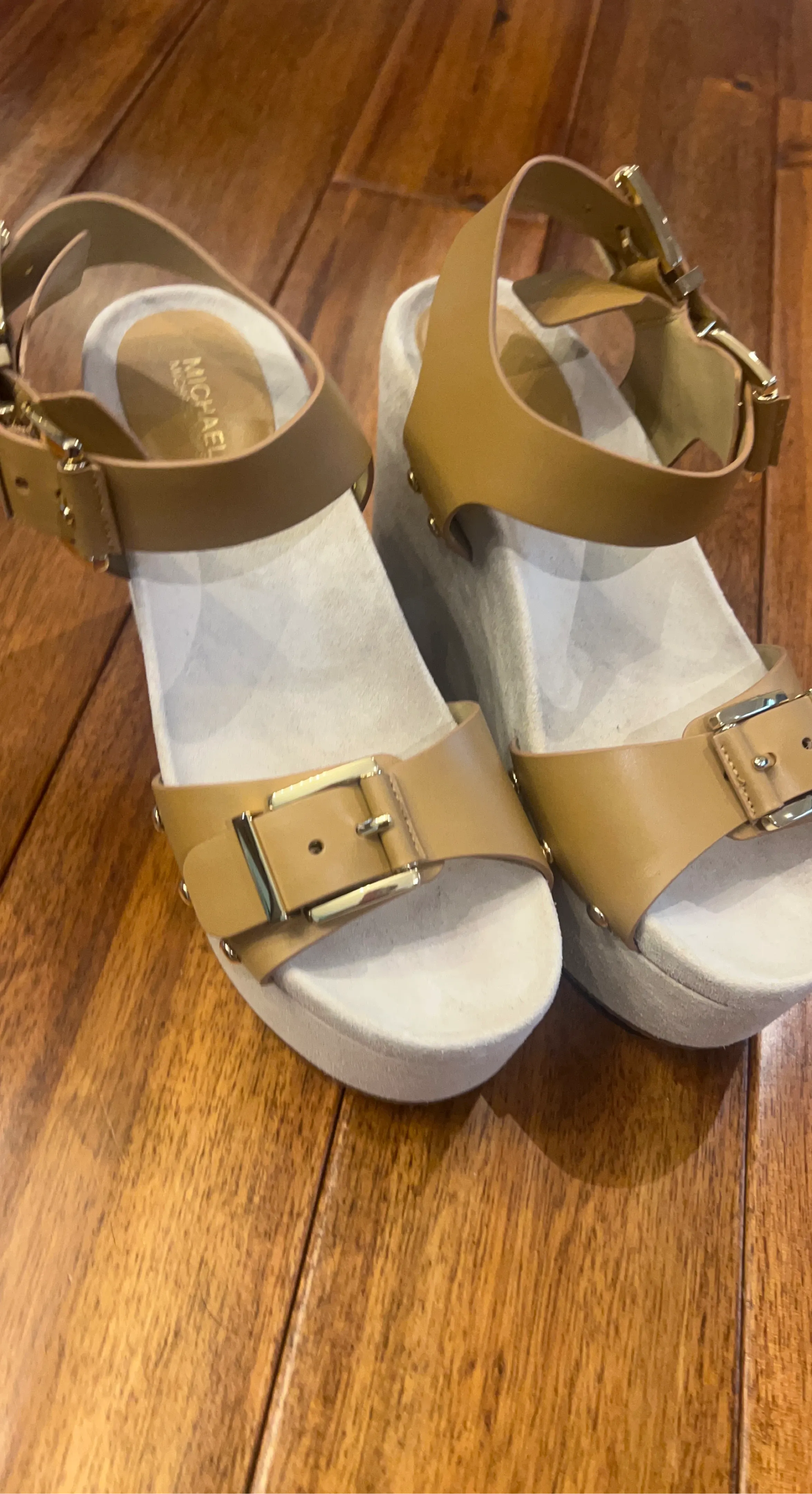 These Michael Kors sandals feature tan leather straps with gold buckle accents. They have a comfortable wedge heel and a cushioned footbed. Perfect for adding a stylish touch to any summer outfit!
