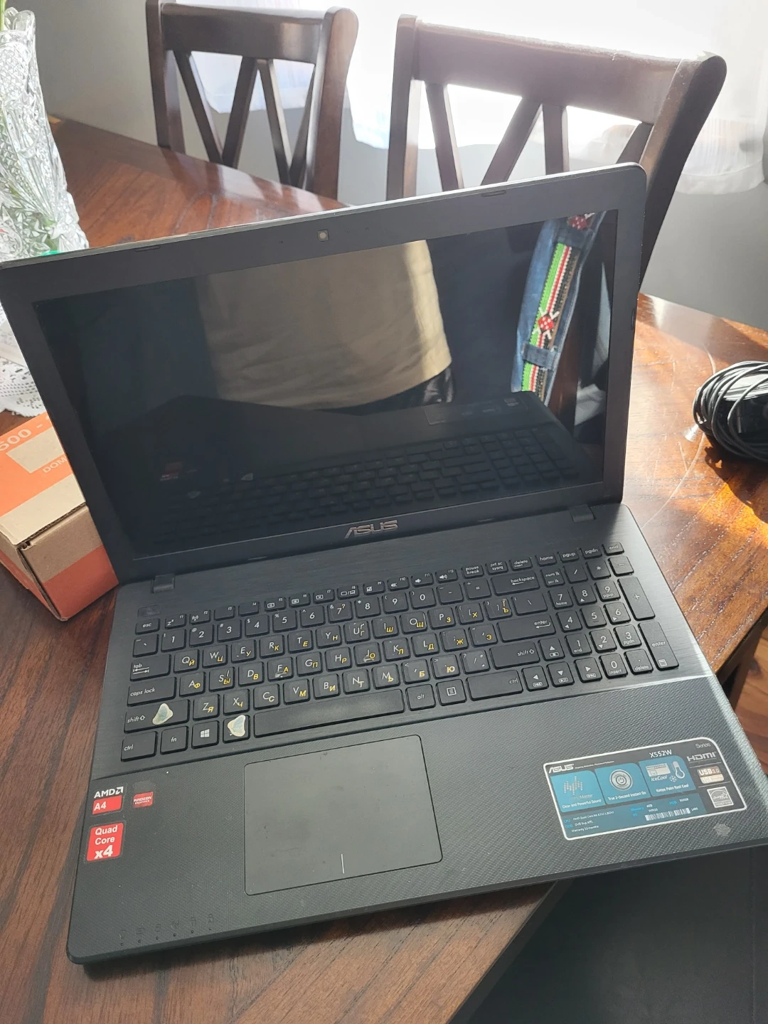 ASUS X552W laptop with SonicMaster sound. It's powered by an AMD Quad Core A4-6210 1.8GHz CPU and has 4GB of RAM. Stopped powering on great for parts!