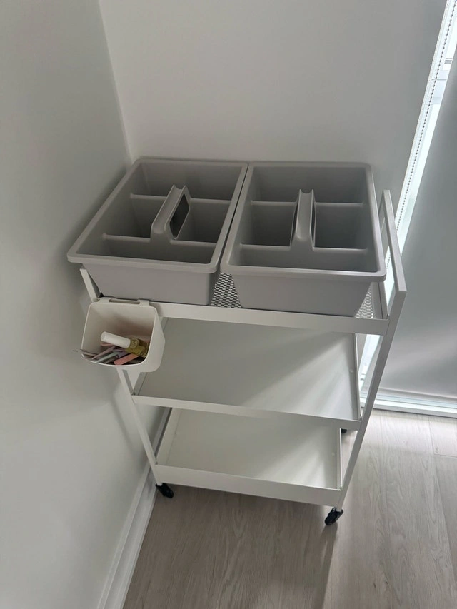 This is a used IKEA cart in good condition, perfect for adding extra storage to any room. It features three shelves and smooth-rolling casters, making it easy to move around. The cart includes two grey storage boxes and a side bin. Three shelves for ample storage. Smooth-rolling casters. Two grey storage boxes. I'm asking $50, which is a fair price considering its condition and functionality. If you're reading this, it's still available!