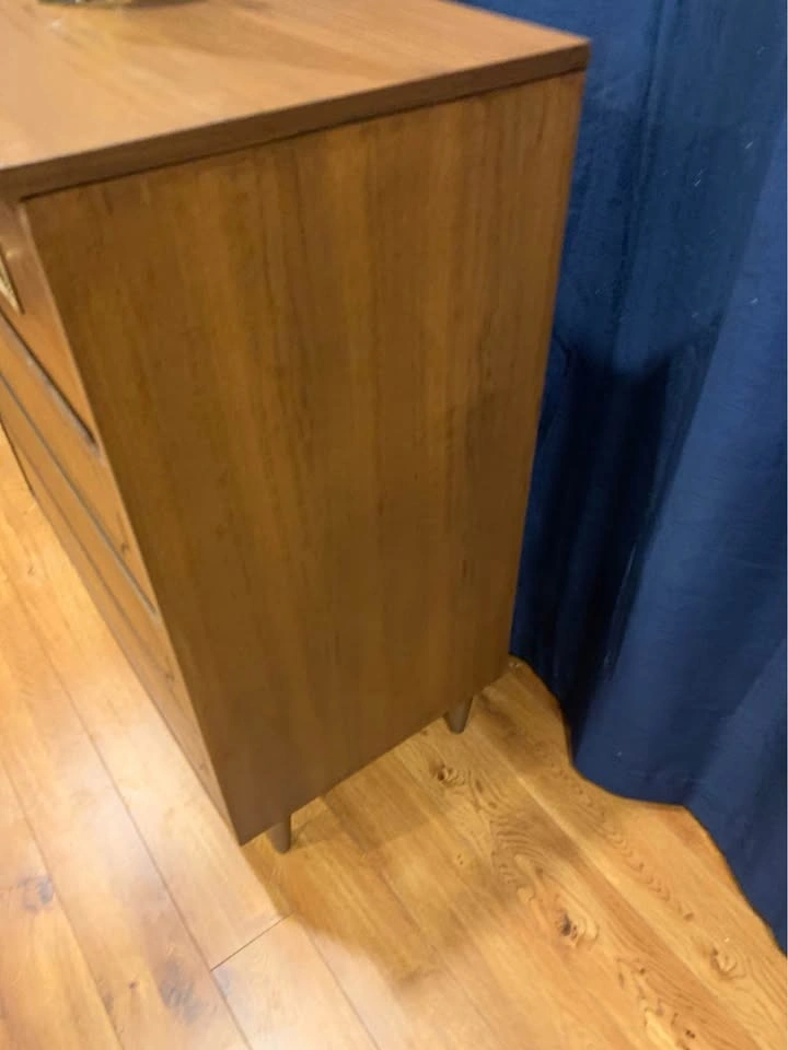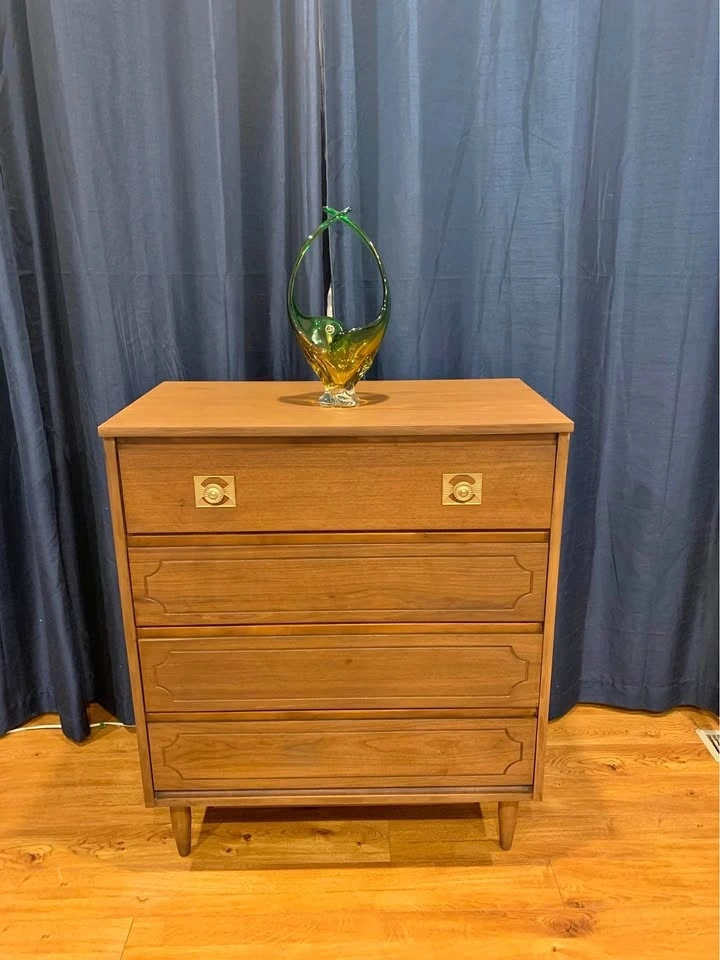 Refinished vintage mid-century modern (MCM) walnut dresser with four drawers. Top drawer has vintage sculptural solid brass pulls, and the last three drawers open from the bottom. All drawers have been freshly lined. Features iconic MCM design characteristics like tapered legs and clean lines. Crafted from solid wood with walnut veneer. Top coated for protection and ready for a new home.