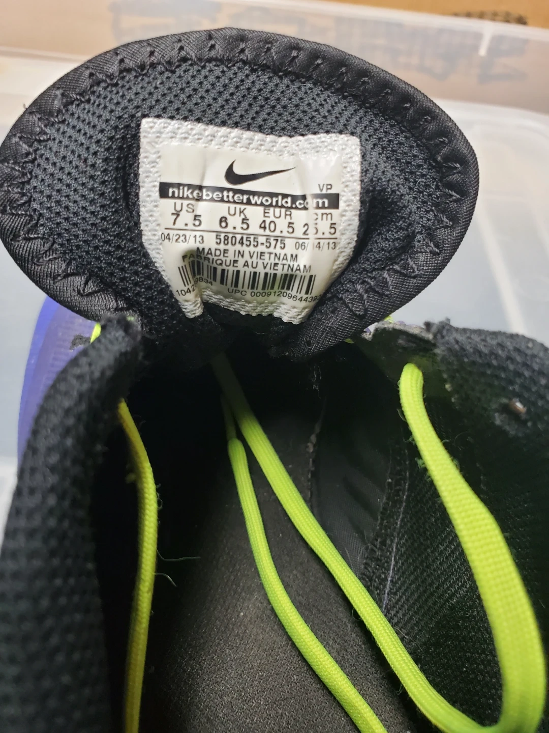 These are Nike FC247 Elastico Pro II indoor soccer shoes in a purple and volt colorway. Has the original volt colorway laces. Could be a neat addition for you Nike enthusiasts.