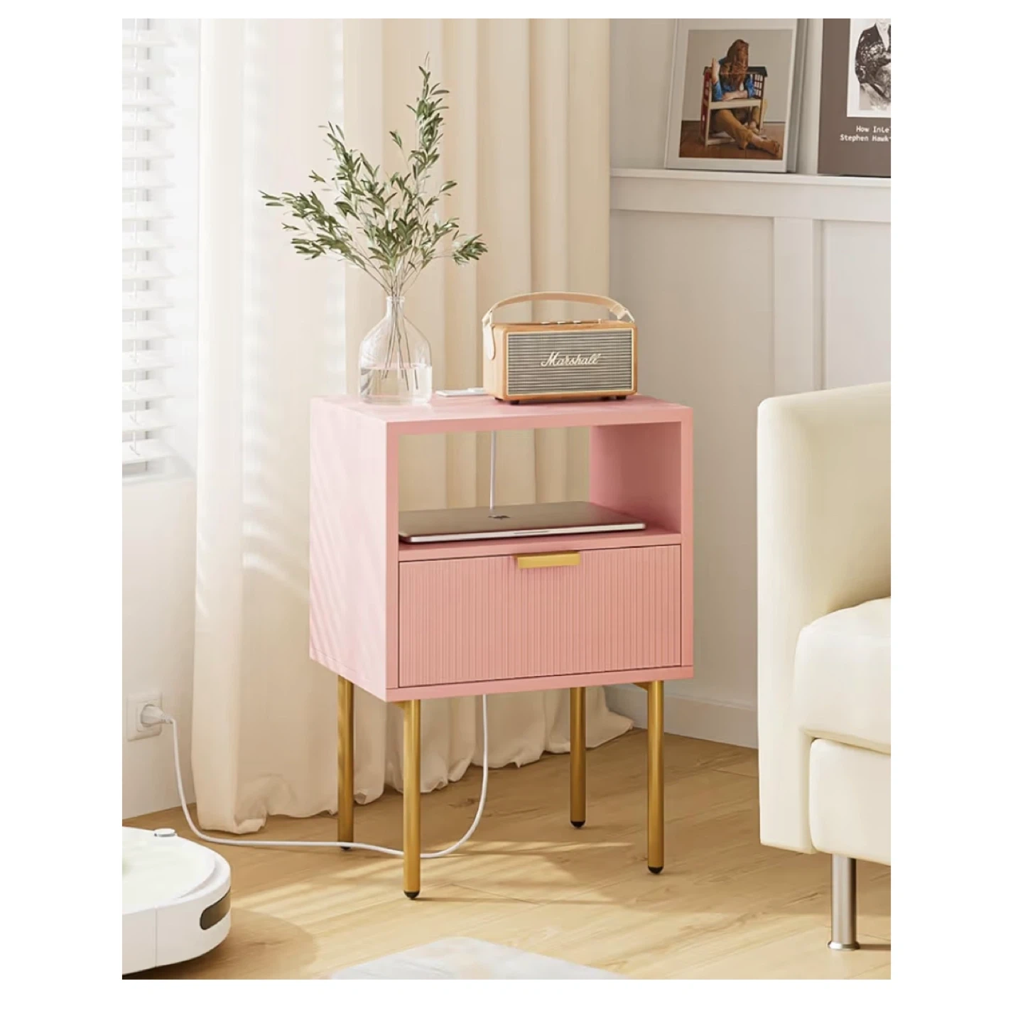 This cute pink nightstand is perfect for any bedroom! It features two AC outlets and two USB ports, so you can easily charge your devices. The nightstand also has a drawer and an open shelf for storage.