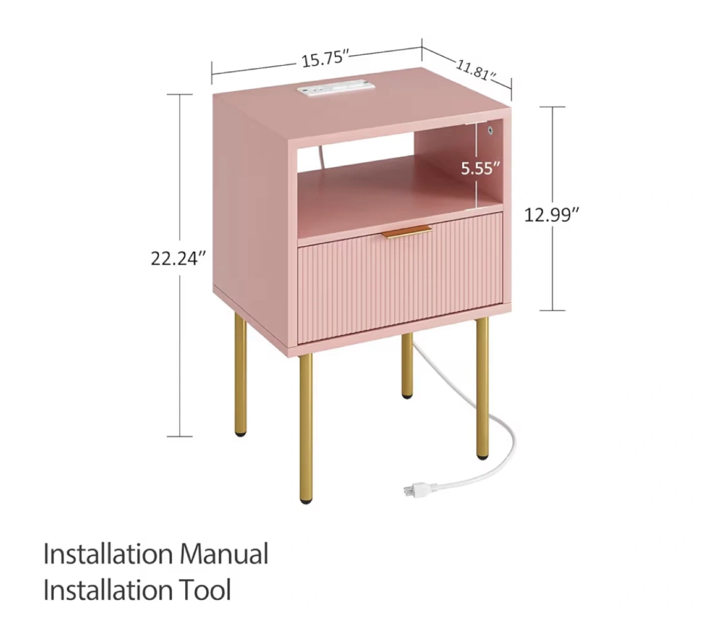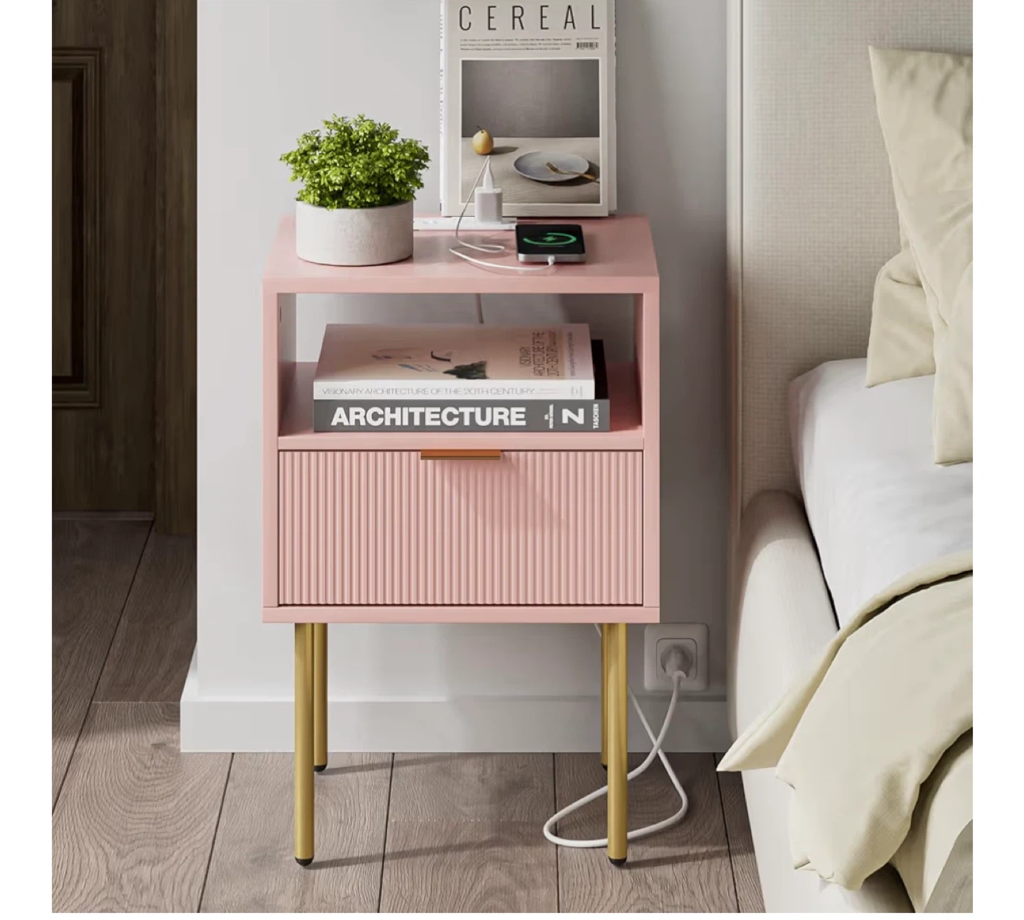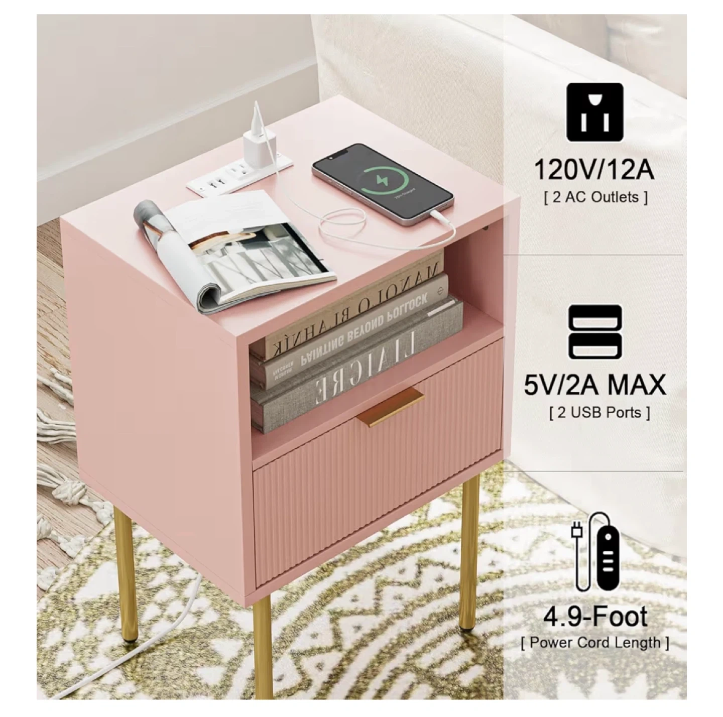 This cute pink nightstand is perfect for any bedroom! It features two AC outlets and two USB ports, so you can easily charge your devices. The nightstand also has a drawer and an open shelf for storage.