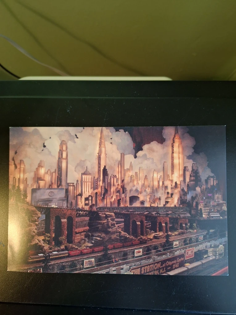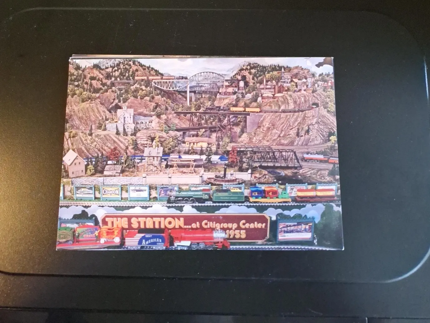 6 post cards from CitiCorp Center train show. This depicts the model train display at the Station at Citigroup Center in 1955. It showcases a detailed miniature landscape with trains, bridges, and buildings. The artwork is vibrant and rich in detail.