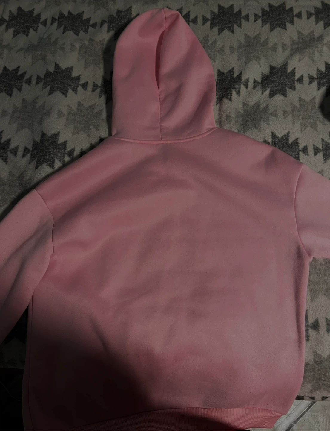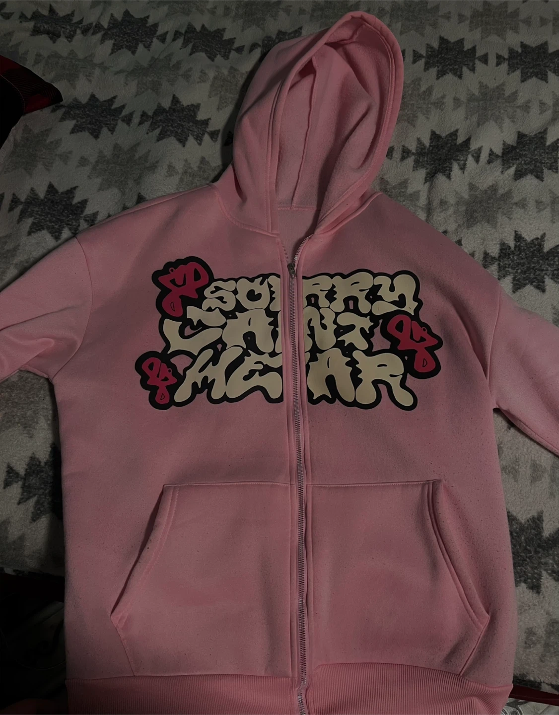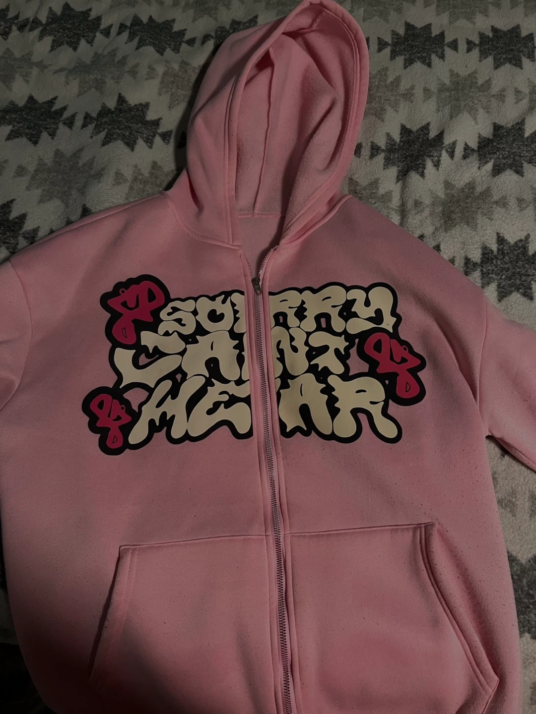 Pink zip-up hoodie with a fun graphic print on the front. It's got a comfortable feel and a full zipper closure. Two front pockets are included for convenience.