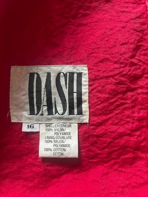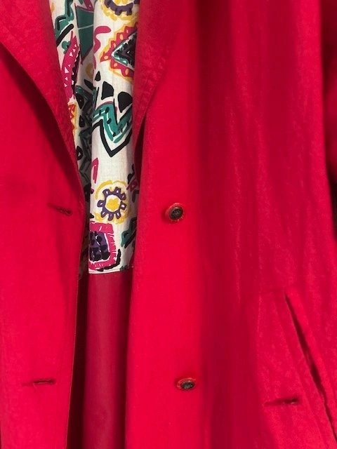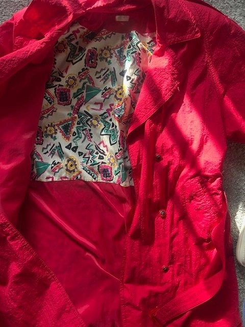 Rare vintage 1980s DASH red trench coat with a bold textured nylon shell and an amazing Memphis-style abstract lining. It's lightweight and eye-catching, perfect for spring, fall, or layering as a statement piece.