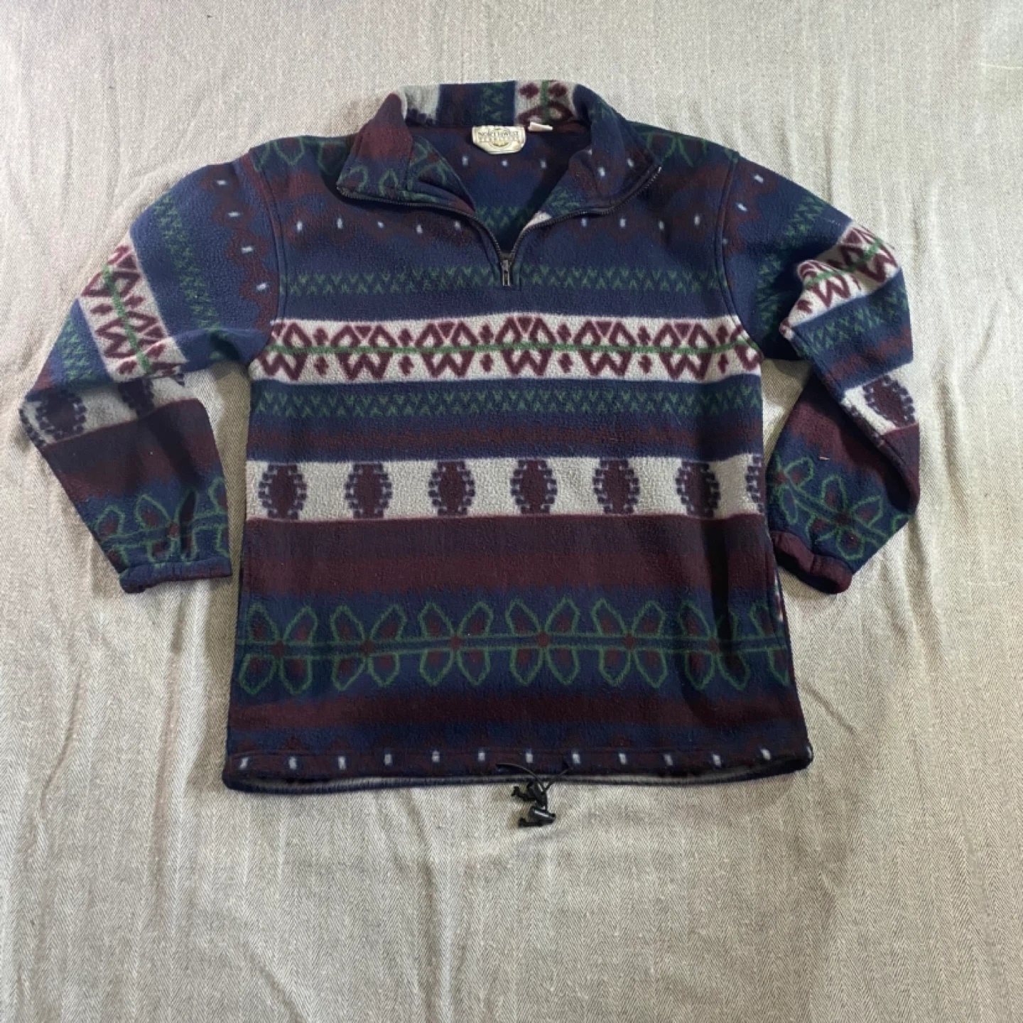 Cozy Northwest Territory pullover sweater with a bold geometric pattern. It's made of 100% polyester for warmth. Size is M/M.