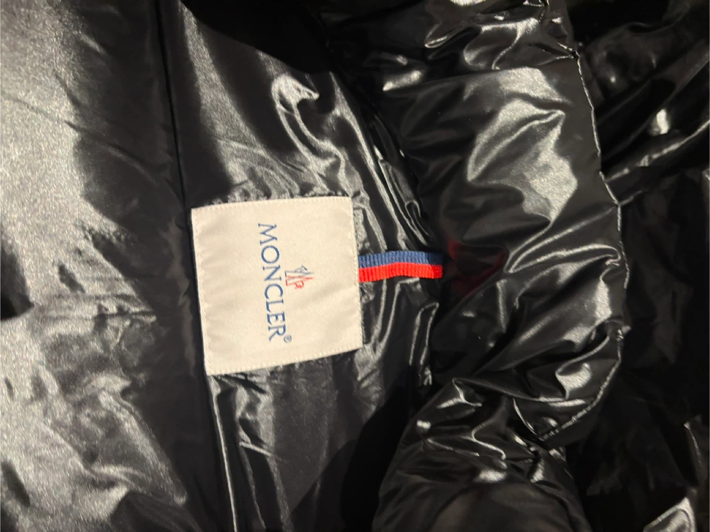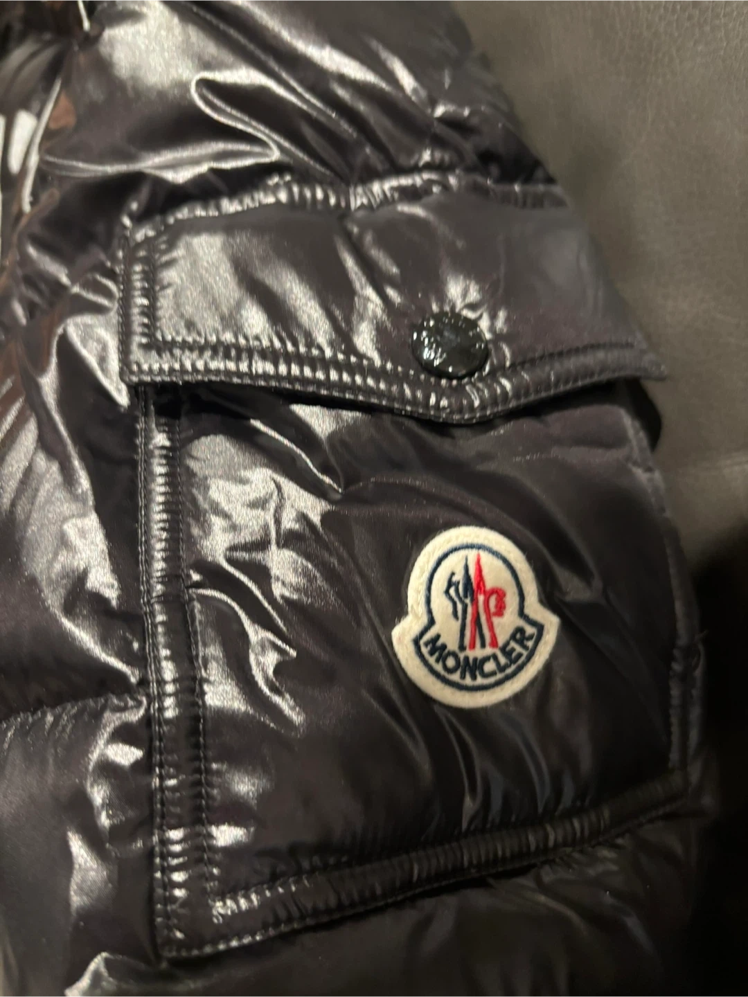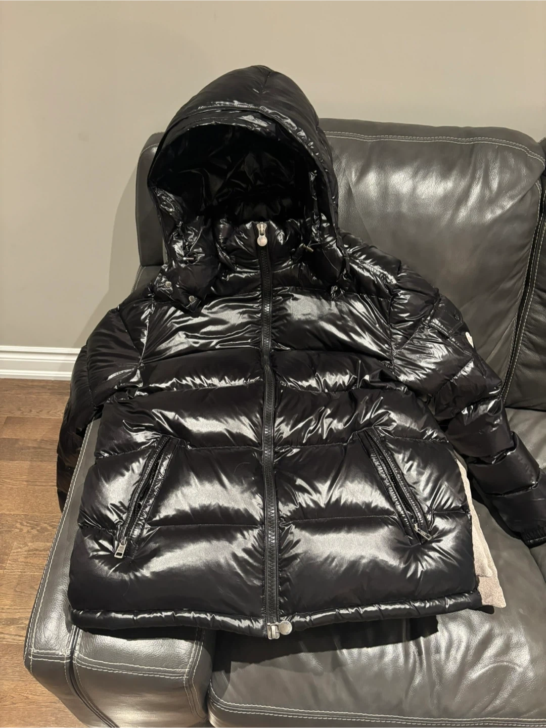 This is a black Moncler puffer jacket with a shiny finish. It features a hood and zippered pockets. A classic style for staying warm.
