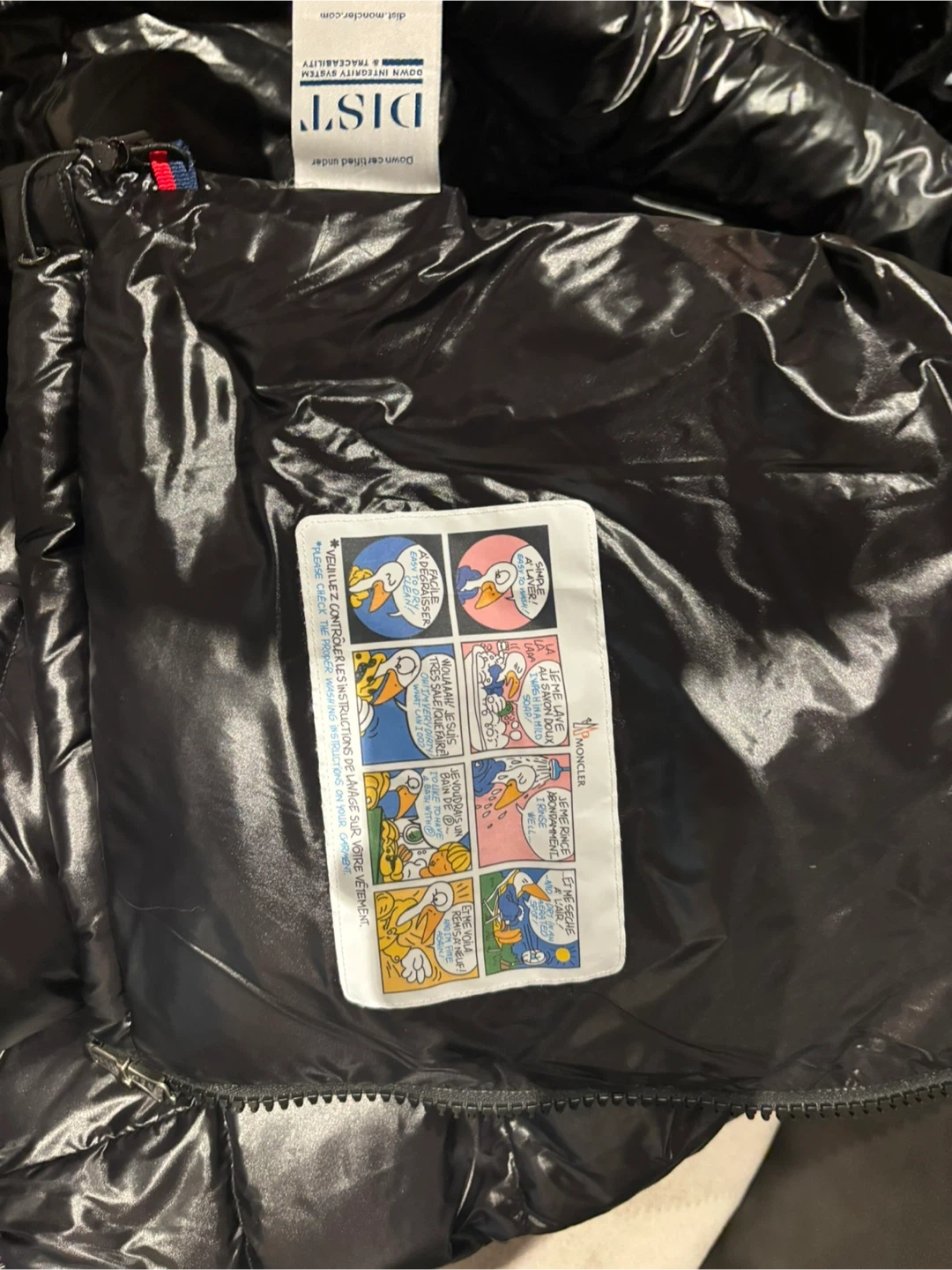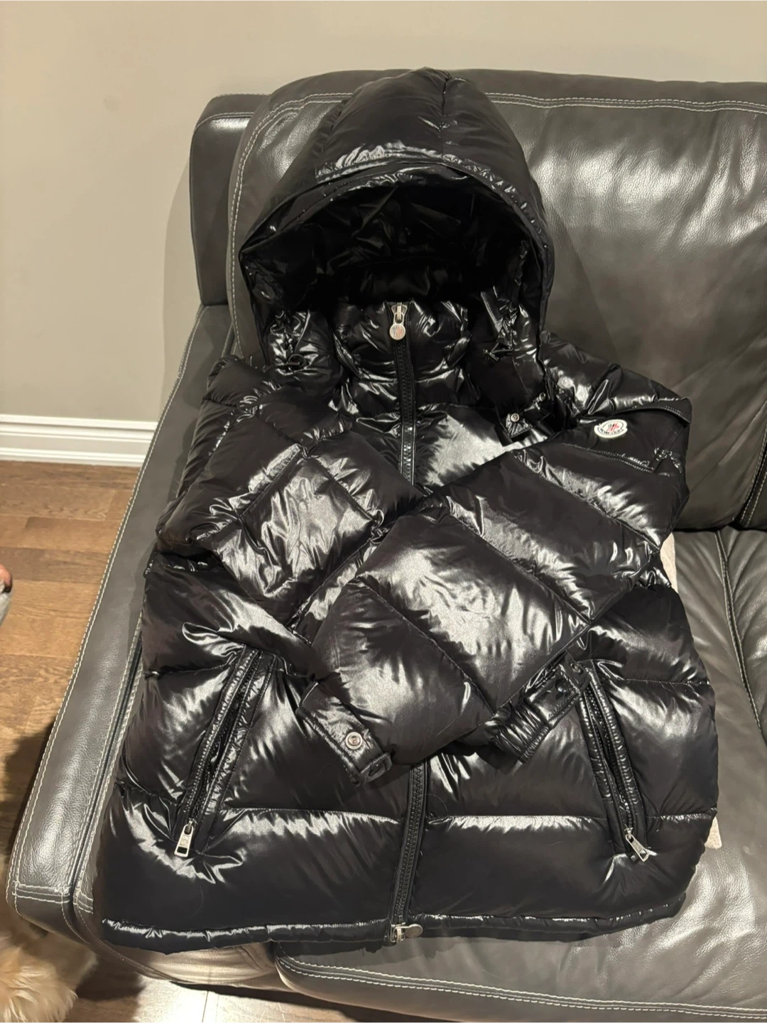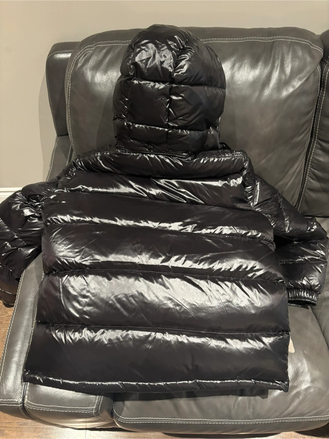 This is a black Moncler puffer jacket with a shiny finish. It features a hood and zippered pockets. A classic style for staying warm.