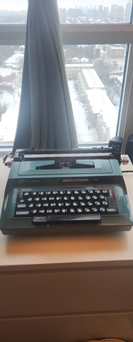 This is a Smith-Corona Electra typewriter in a nice teal colour. It has a full QWERTY keyboard with power space. This typewriter is great for writers or anyone who enjoys a vintage typing experience!