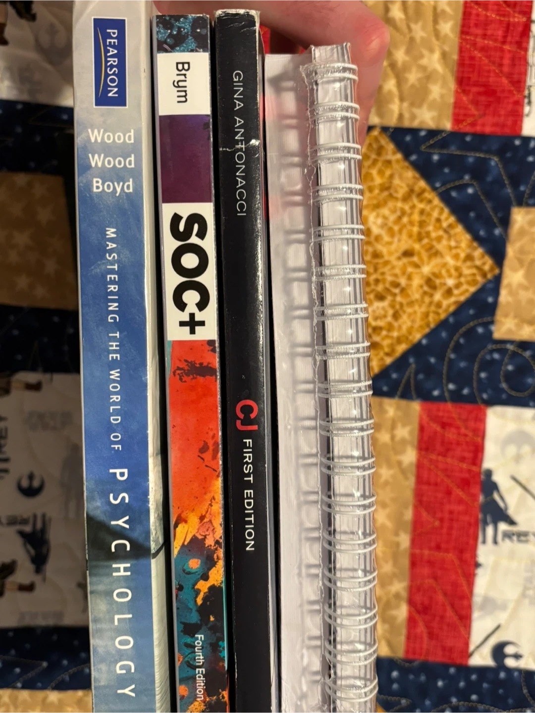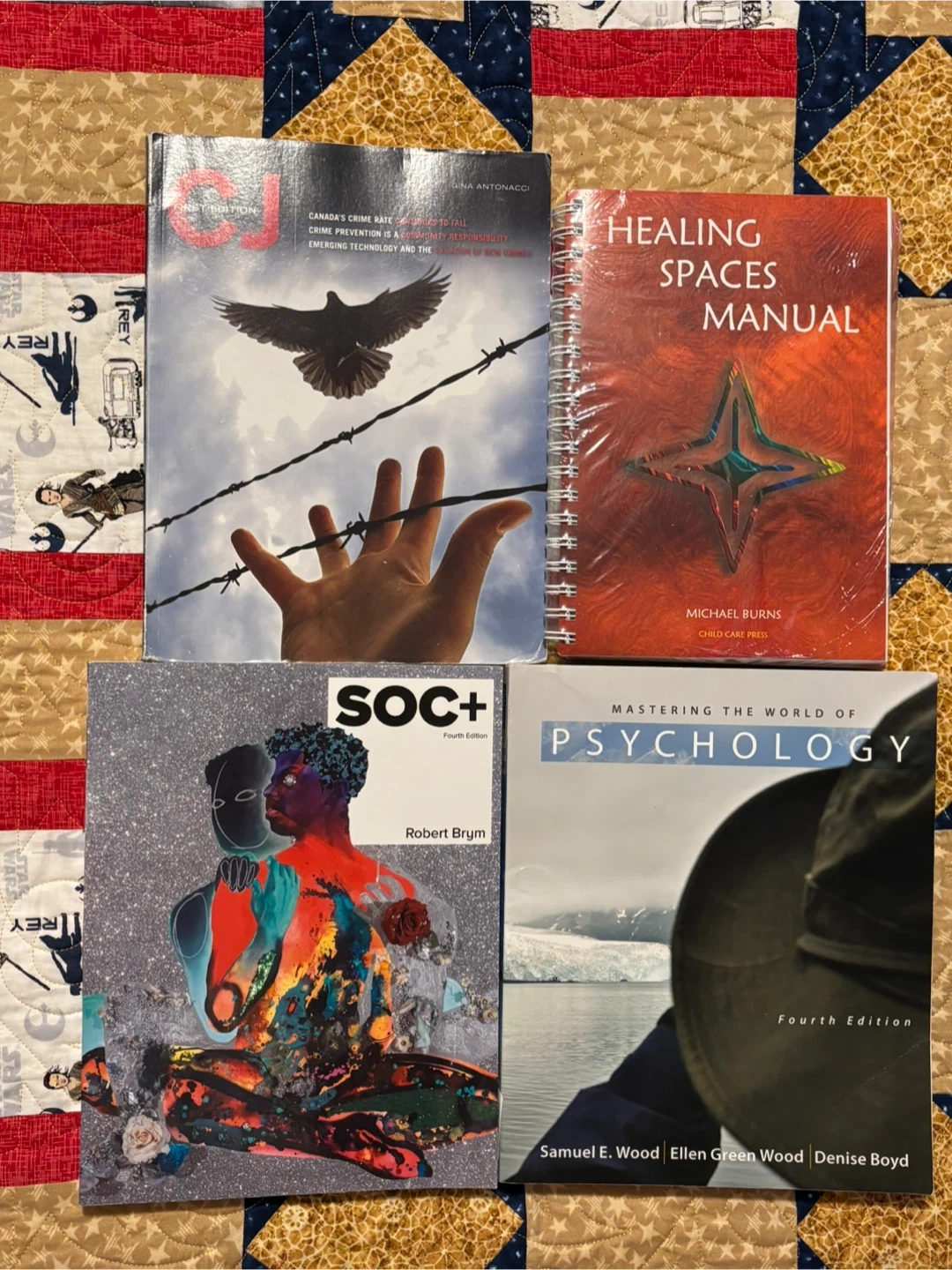Bundle includes 'Mastering the World of Psychology' (4th Ed.), 'SOC+ Fourth Edition', 'CJ First Edition', and 'Healing Spaces Manual'. Great for university students. These books are essential for learning about psychology, sociology, and criminal justice.