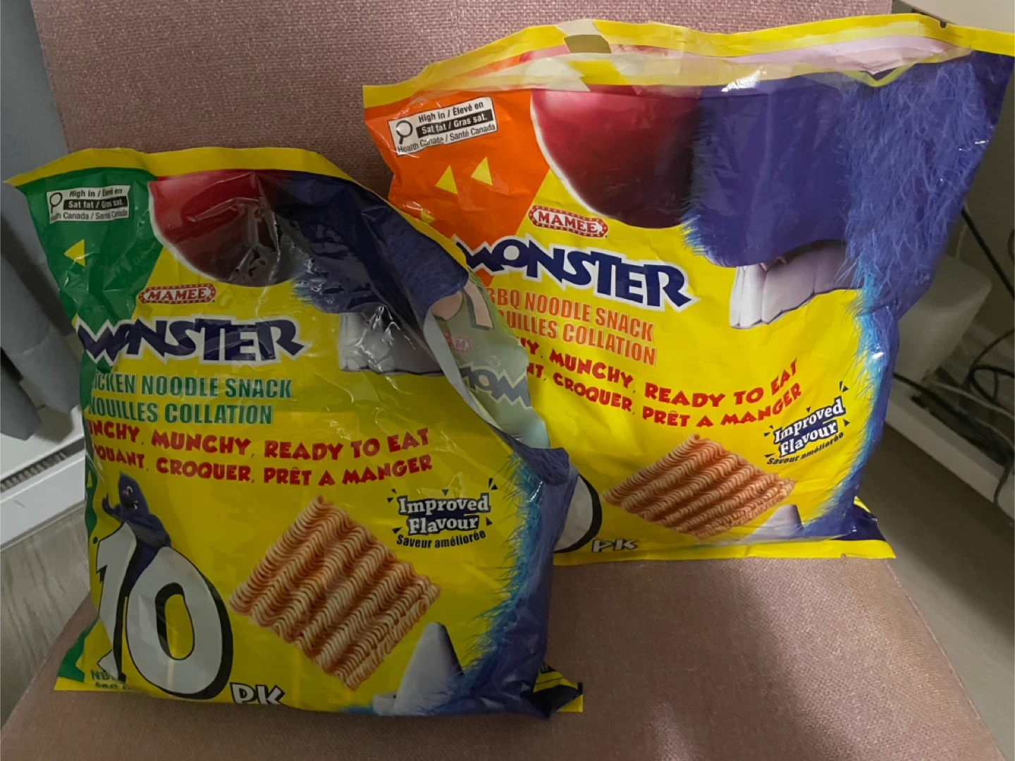 Two opened bags of Mamee Monster noodle snacks. About 50% of individual sealed packages left inside. Please note they are already passed the best before dates. Available in Chicken and BBQ flavours, these snacks are munchy and ready to eat. Improved flavour for a tastier snack experience!