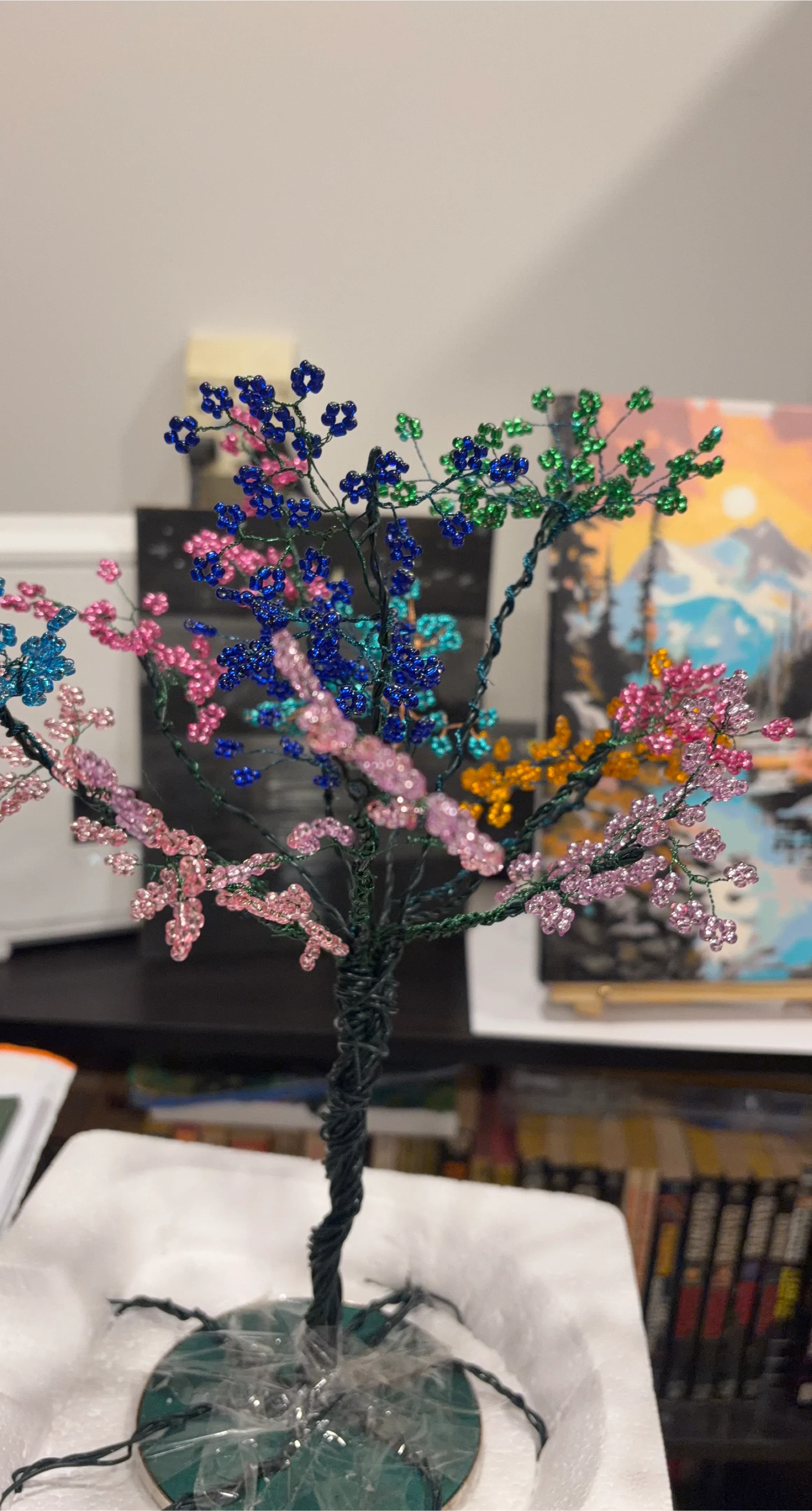 This is a colourful, handmade beaded tree sculpture. It's crafted with wire and small beads in various shades of pink, blue, green, and orange. The base appears ceramic pot wire roots. It's a lovely decorative piece for any home!