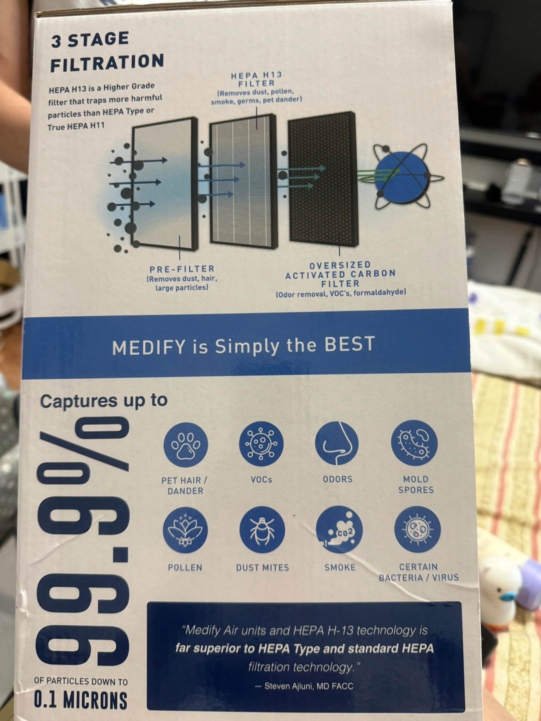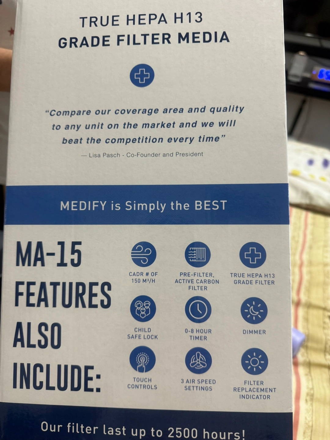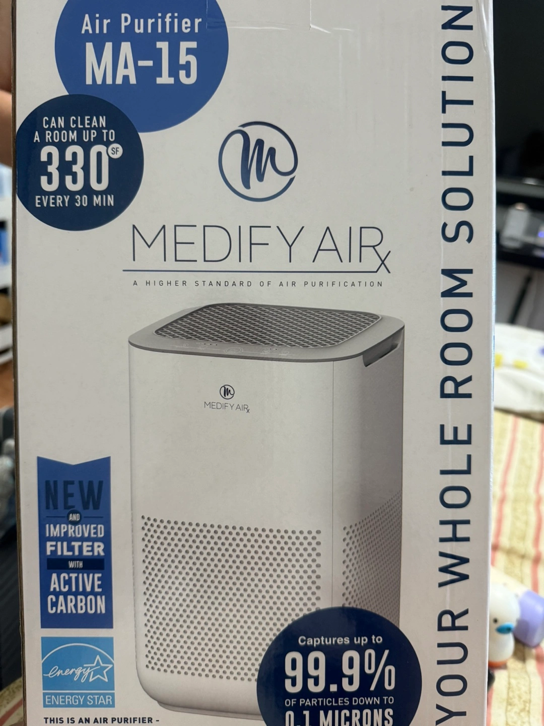 New Medify Air MA-15 air purifier. Energy Star certified. Three-stage filtration system. Captures 99.9% of particles down to 0.1 microns. Features include a child safe lock, 8-hour timer, dimmer, touch controls, and three air speed settings. CADR of 150 m³/h. Filter replacement indicator.